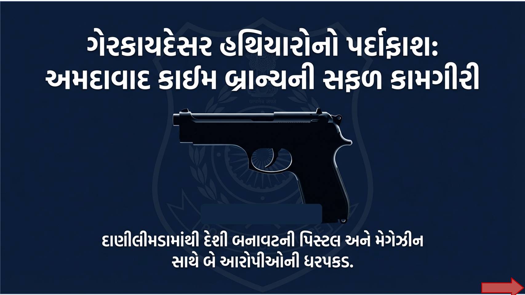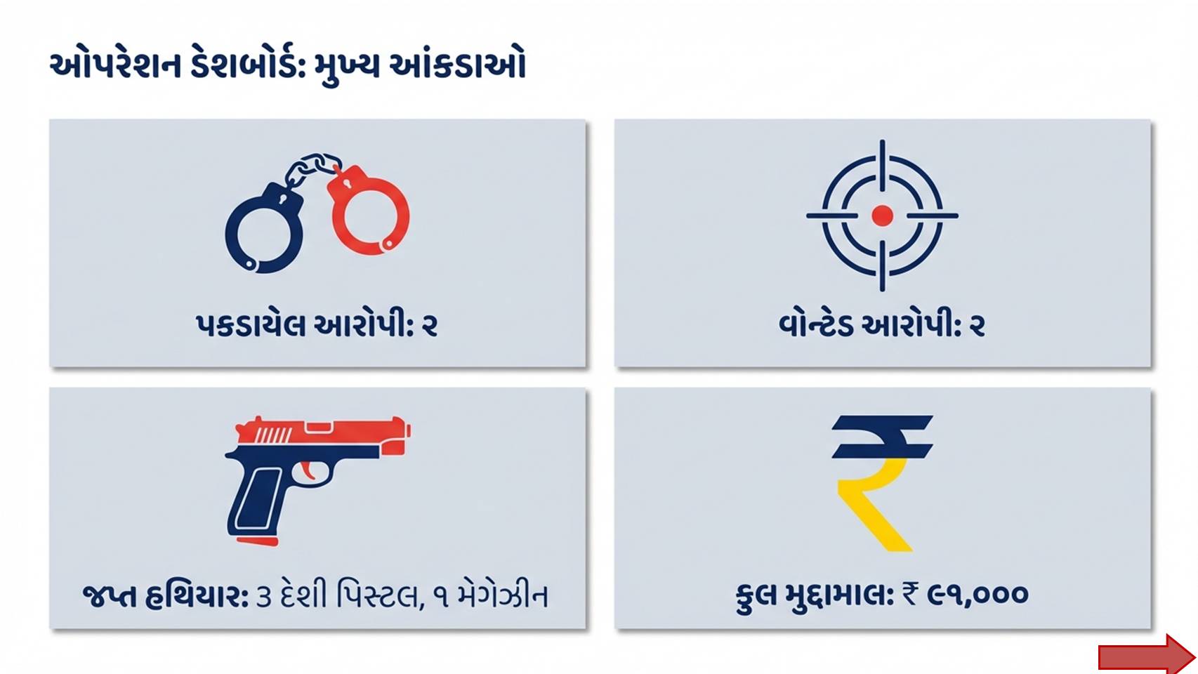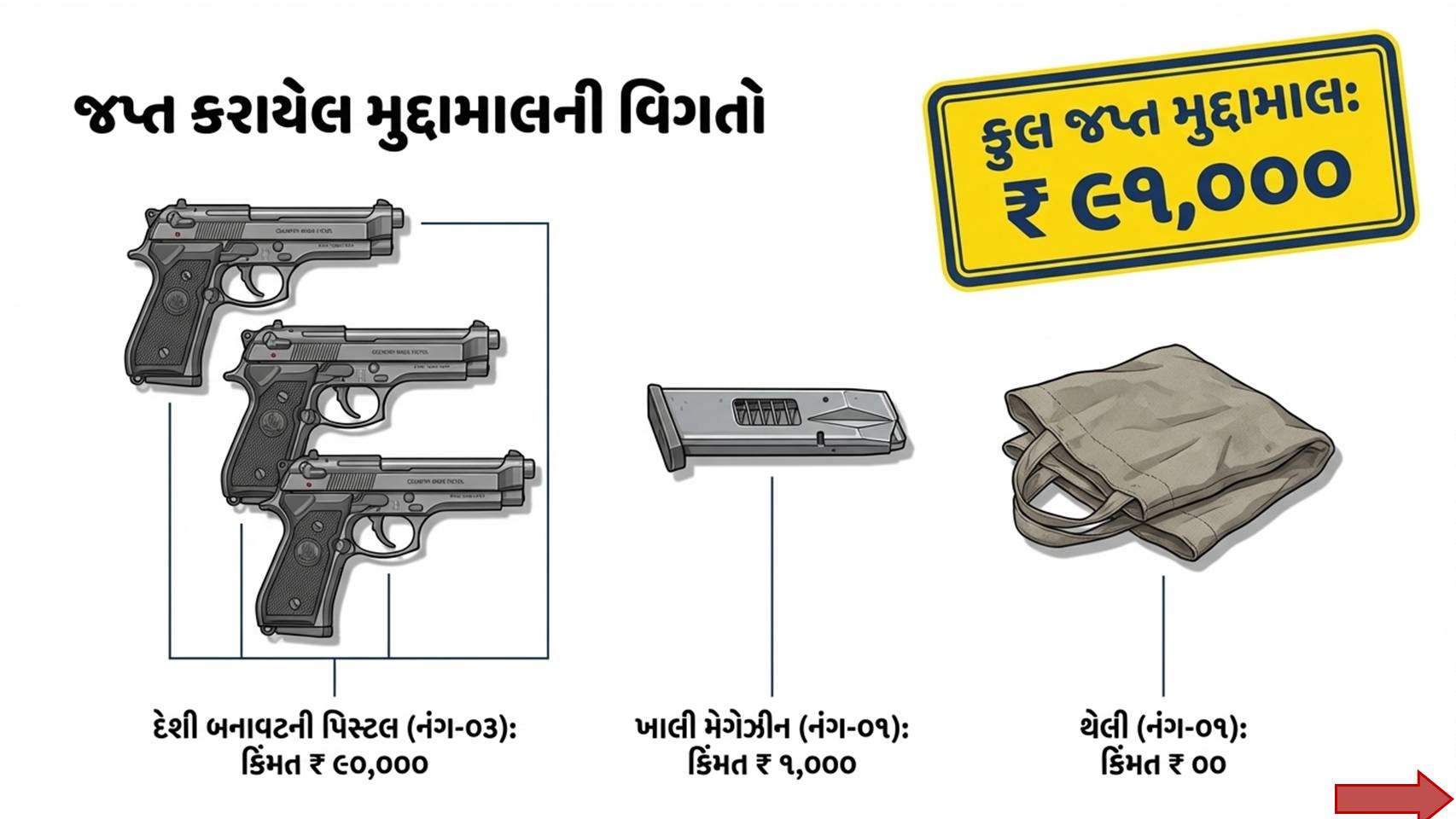 - દેશી બનાવટની પિસ્તોલ: ૩ નંગ (કિંમત રૂ. ૯૦,૦૦૦)