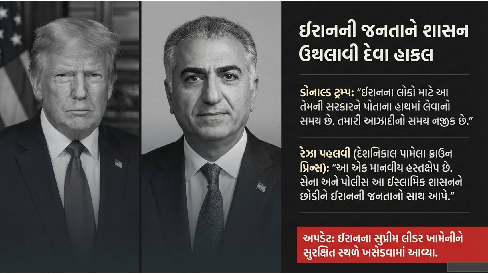 મહાયુદ્ધ : ડોનાલ્ડ ટ્રમ્પે ઈરાનના નાગરિકોને અપીલ કરી છે કે, “તમારી આઝાદીની ઘડી નજીક છે, તમારી સરકાર પર કબજો કરી લો”. વડાપ્રધાન નેતન્યાહુએ પણ કહ્યું કે, ઈરાની લોકો માટે જુલમી શાસન ફેંકી દેવાનો આ સમય આવી ગયો છે. દરમિયાન, ઈરાનના સર્વોચ્ચ નેતા આયાતુલ્લા અલી ખામેનેઈને સુરક્ષિત સ્થાને ખસેડવામાં આવ્યા છે. ઈરાનના પ્રમુખ મસૂદ પેઝેશ્કિયન સુરક્ષિત હોવાના અહેવાલ છે.