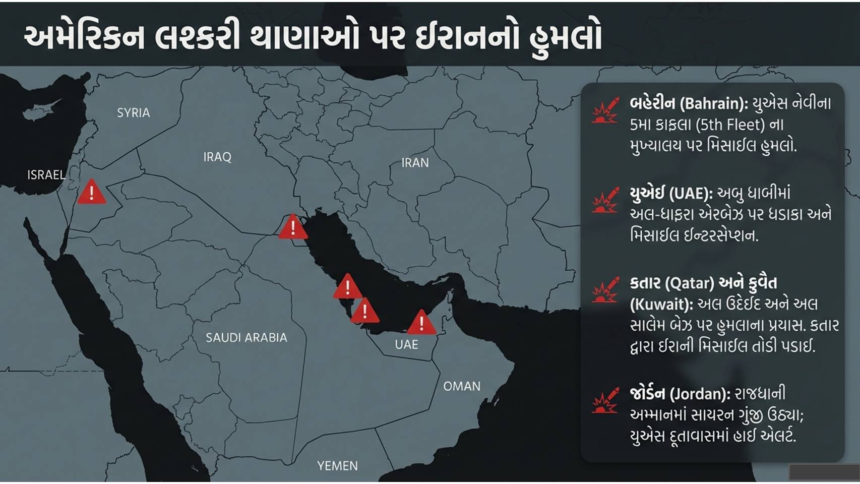 મહાયુદ્ધ : વધુમાં, ઈરાને ખાડી દેશોમાં આવેલા અમેરિકી સૈન્ય મથકો પર પણ વળતા હુમલા કર્યા છે. બહેરીનમાં આવેલા અમેરિકી નૌકાદળના 5માં કાફલાના મુખ્યાલય (5th Fleet) પર મિસાઈલ હુમલો થયો હોવાના અહેવાલ છે. કતારના અલ-ઉદૈદ, કુવૈતના અલ-સાલેમ અને જોર્ડનના મુવફ્ફાક અલ-સાલ્ટી એરબેઝ પર પણ ઈરાની મિસાઇલો ત્રાટકી છે.