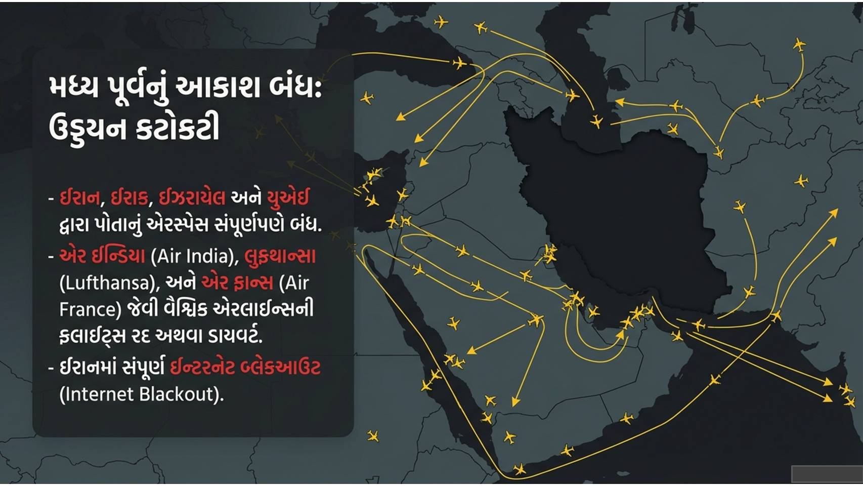 મહાયુદ્ધ : યુદ્ધને કારણે મધ્ય પૂર્વની એરસ્પેસ બંધ કરી દેવામાં આવી છે. એર ઇન્ડિયાની દિલ્હી-તેલ અવીવ ફ્લાઇટ હવામાંથી જ ભારત પરત બોલાવી લેવામાં આવી હતી. લુફ્થાન્સા અને એર ફ્રાન્સ જેવી એરલાઇન્સે પણ ફ્લાઇટ્સ રદ કરી છે. ભારતીય દૂતાવાસે ઈરાન, ઇઝરાયેલ અને કતારમાં રહેતા ભારતીયો માટે કડક સુરક્ષા એડવાઈઝરી જારી કરી છે અને સતર્ક રહેવા જણાવ્યું છે.