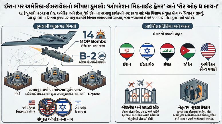 મહાયુદ્ધ : 28 ફેબ્રુઆરી, 2026ના રોજ મધ્ય પૂર્વમાં યુદ્ધની જ્વાળાઓ ફાટી નીકળી છે. અમેરિકા અને ઇઝરાયેલે સંયુક્ત રીતે ઈરાનના પરમાણુ મથકો અને સૈન્ય ઠેકાણાઓ પર ભીષણ હુમલા શરૂ કર્યા છે, જેને પગલે સમગ્ર વિસ્તારમાં અરાજકતા ફેલાઈ ગઈ છે.
