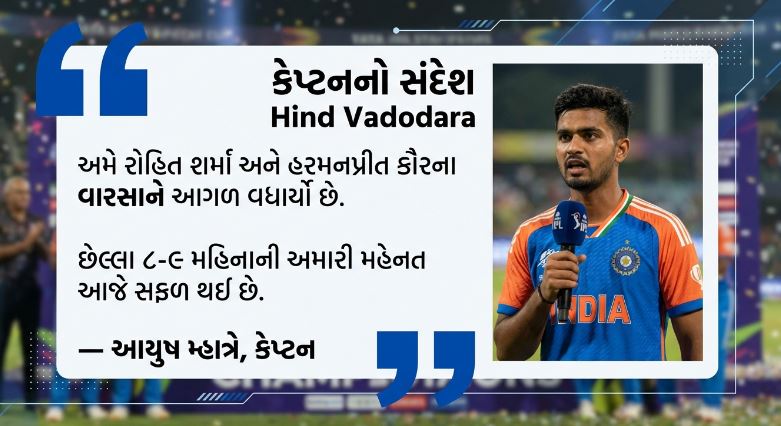 અંડર19 વર્લ્ડકપ 2026 : કેપ્ટન આયુષ મ્હાત્રેએ ટ્રોફી સ્વીકારતા જણાવ્યું હતું કે, “અમે રોહિત શર્મા અને હરમનપ્રીત કૌર દ્વારા સ્થાપિત વારસાને આગળ વધારી રહ્યા છીએ તેનો અમને ગર્વ છે”. ભારત અત્યારે ટી20 વર્લ્ડ કપ, મહિલા ક્રિકેટ વર્લ્ડ કપ અને અંડર-19 વર્લ્ડ કપ ત્રણેયમાં ચેમ્પિયન છે.