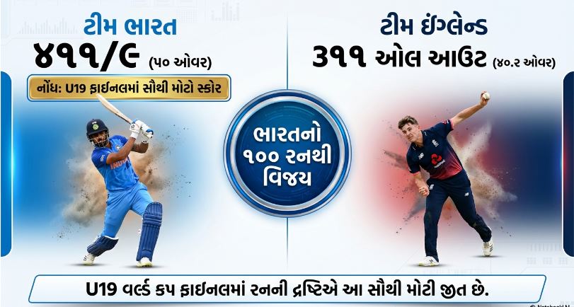 અંડર19 વર્લ્ડકપ 2026 : ફાઈનલમાં ભારતે જે રીતે જીત મેળવી, તે માત્ર એક ટ્રોફી જીત નથી, પરંતુ ભારતીય ક્રિકેટ સિસ્ટમની મજબૂતી, ગ્રાસરૂટ લેવલની મહેનત અને આવનારા સુપરસ્ટાર્સની ઝલક છે. ફાઈનલ મેચમાં ભારતીય ટીમે દરેક વિભાગમાં દબદબો બતાવીને એક યાદગાર વિજય નોંધાવ્યો અને દેશભરના કરોડો ક્રિકેટપ્રેમીઓને ગર્વની અનુભુતી કરાવી છે.