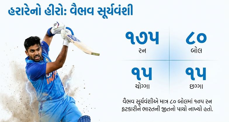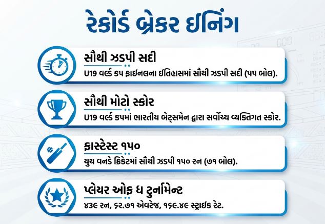અંડર19 વર્લ્ડકપ 2026 : ભારતની આ જીતનો મુખ્ય સ્તંભ 15 વર્ષીય વૈભવ સૂર્યવંશી રહ્યો છે. તેણે ફાઇનલમાં માત્ર 80 બોલમાં 175 રનની જે ઇનિંગ રમી, તે કોઈપણ વર્લ્ડ કપ ફાઇનલના ઇતિહાસમાં સર્વોચ્ચ વ્યક્તિગત સ્કોર છે. આ ઇનિંગની કેટલીક મહત્વની બાબતો: