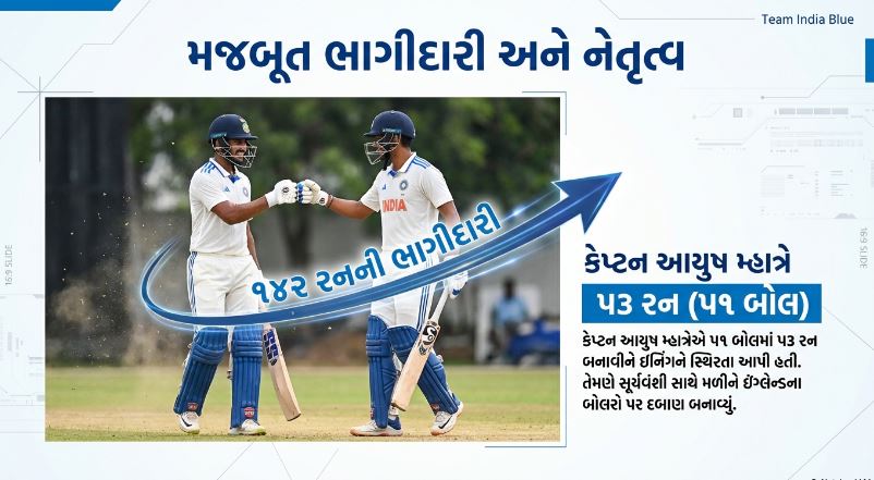 કેપ્ટનની ભૂમિકા: આયુષ મ્હાત્રેએ 53 રન બનાવીને વૈભવ સાથે 142 રનની મહત્વની ભાગીદારી કરી હતી.