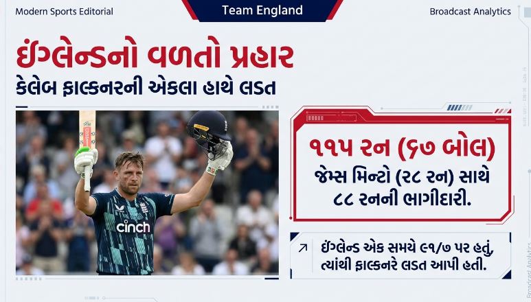 • ઇંગ્લેન્ડ તરફથી કેલેબ ફાલ્કનરે 67 બોલમાં 115 રનની લડાયક ઇનિંગ રમી હતી, પરંતુ તેને અન્ય બેટ્સમેનોનો સાથ મળ્યો ન હતો.