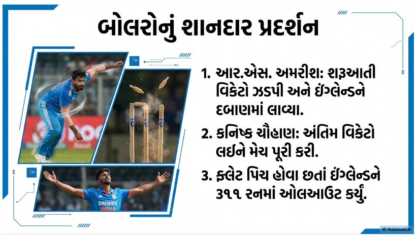 • અંતે, ખિલન પટેલે બેકવર્ડ પોઈન્ટ પર શાનદાર કેચ પકડીને ઇંગ્લેન્ડની છેલ્લી વિકેટ પાડી હતી અને ભારતને વિજય અપાવ્યો હતો.
