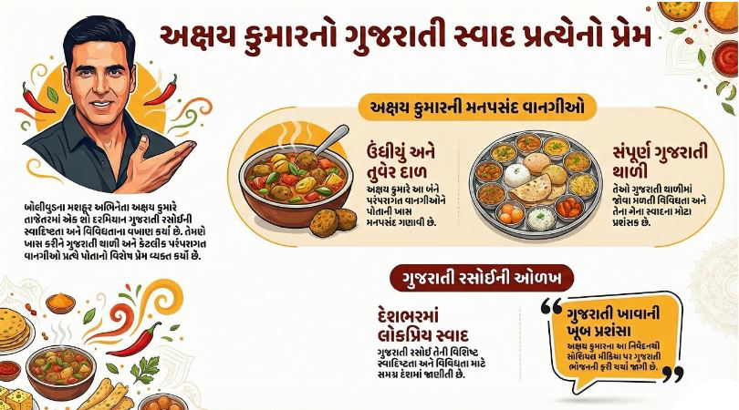 બોલીવુડના સુપરસ્ટાર અને ફિટનેસ આઈકોન ખેલાડી કુમાર હંમેશા પોતાની શિસ્તબદ્ધ લાઈફસ્ટાઈલ માટે જાણીતા છે. પરંતુ, શું તમે જાણો છો કે આ ‘ખેલાડી’ કુમારના મનમાં કઈ વાનગીઓ વસેલી છે? તાજેતરમાં એક શો દરમિયાન અક્ષય કુમારે ગુજરાતી ભોજન પ્રત્યેનો પોતાનો અતૂટ પ્રેમ વ્યક્ત કરીને સૌને ચોંકાવી દીધા છે.