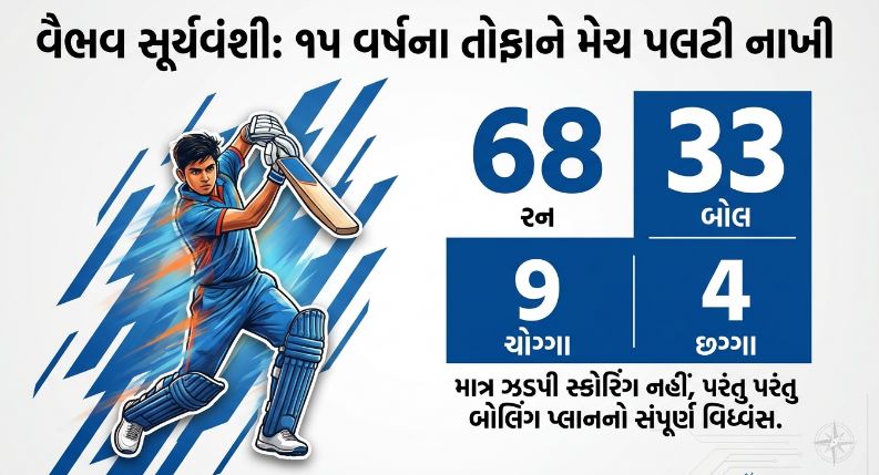૩૧૧ રનના લક્ષ્યાંક સામે ભારત જ્યારે મેદાનમાં ઉતર્યું ત્યારે સૌને લાગતું હતું કે આ મેચ અંતિમ ઓવર સુધી જશે. પરંતુ ૧૫ વર્ષના વૈભવ સૂર્યવંશીના મનમાં કંઈક અલગ જ હતું. તેણે અફઘાન બોલરો પર એવો હુમલો કર્યો કે રમતનું ચિત્ર જ બદલાઈ ગયું. માત્ર ૩૩ બોલમાં ૯ ચોગ્ગા અને ૪ છગ્ગા સાથે ૬૮ રન ફટકારીને તેણે પ્રથમ ૯ ઓવરમાં જ ભારતના ૯૦ રન કરી નાખ્યા હતા. આ આક્રમણે અફઘાનિસ્તાનના આત્મવિશ્વાસને તોડી નાખ્યો.