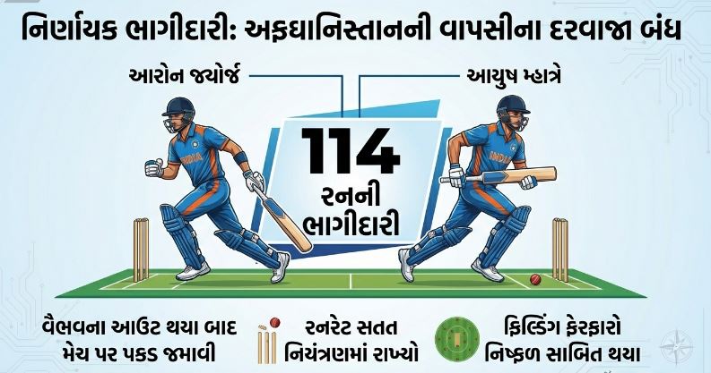 અન્ડર 19 વર્લ્ડકપ 2026 : આરોન–આયુષની 114 રનની ભાગીદારીએ રનરેટને સતત નિયંત્રણમાં રાખ્યો. બંન્નેની આયોજનબદ્ધ બેટિંગ અફઘાન બોલરો માટે કપરા ચઢાણ સાબિત થઈ. અફધાન કેપ્ટન દ્વારા કરાયેલા ફિલ્ડિંગના ફેરફાર પણ નિષ્ફળ સાબિત થયા.