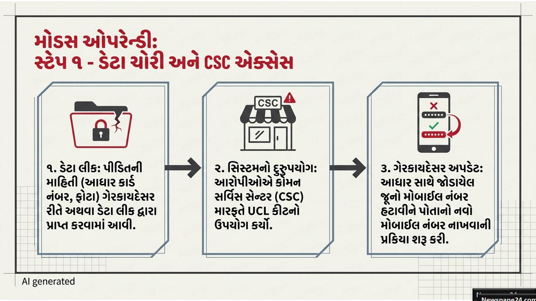 અમદાવાદ : ગુનેગારોનું નવું હથિયાર આ ગેંગની સૌથી ચોંકાવનારી વાત તેમની કામ કરવાની પદ્ધતિ (Modus Operandi) છે. તેઓ પીડિત વ્યક્તિનો ડેટા ગમે ત્યાંથી મેળવી લેતા હતા. ત્યારબાદ, CSC (Common Service Center) સેન્ટરની UCL કીટનો ઉપયોગ કરીને આધાર કાર્ડમાં નવો મોબાઈલ નંબર અપડેટ કરવાની પ્રક્રિયા શરૂ કરતા.