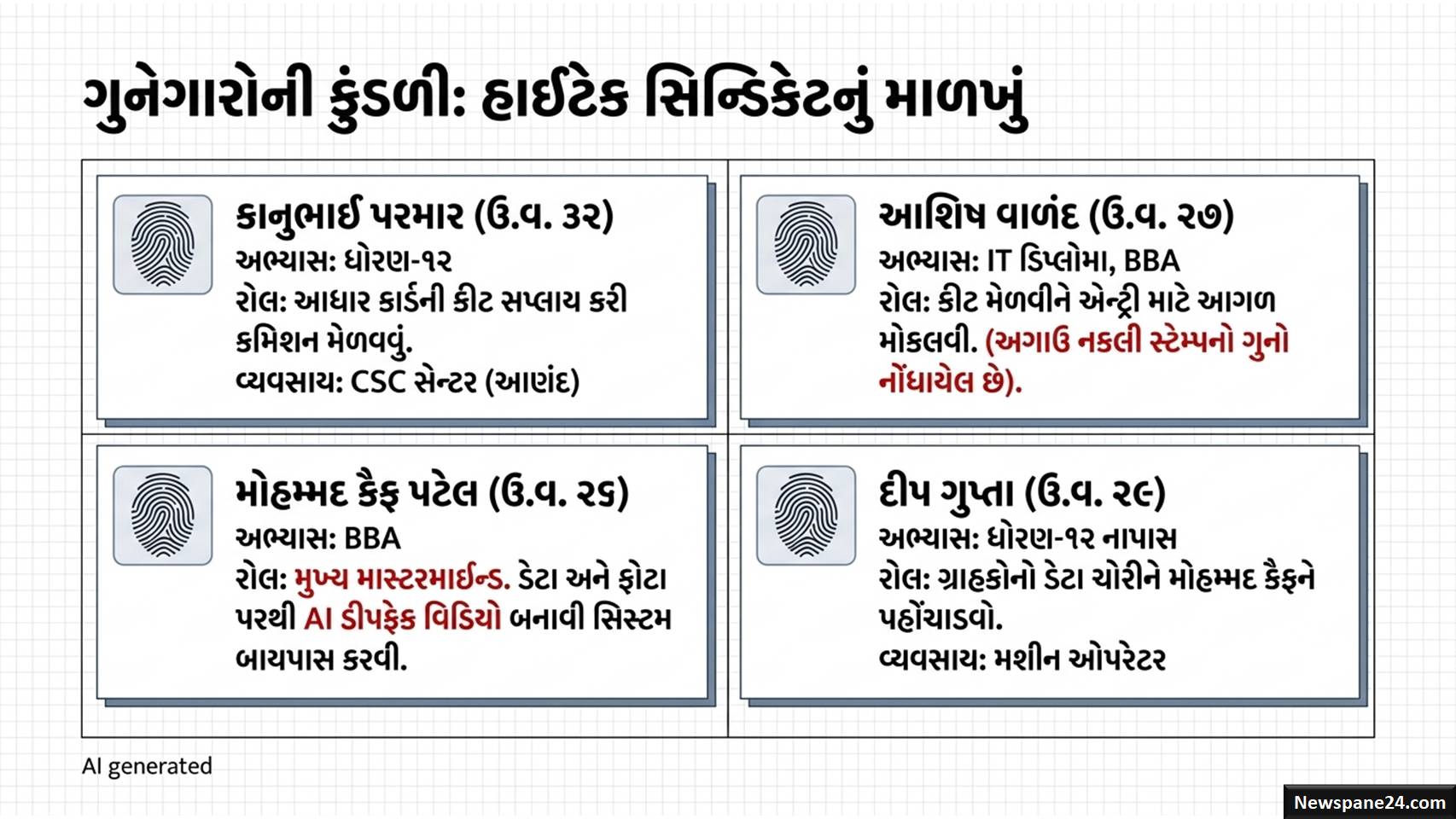 1. કનુભાઈ બહાદુરસિંહ પરમાર (ઉં.વ. ૩૨): આણંદના બોરસદનો રહેવાસી છે અને CSC સેન્ટર ચલાવે છે. તેણે આધાર કાર્ડની કીટ અન્ય આરોપીઓને પૂરી પાડી હતી.