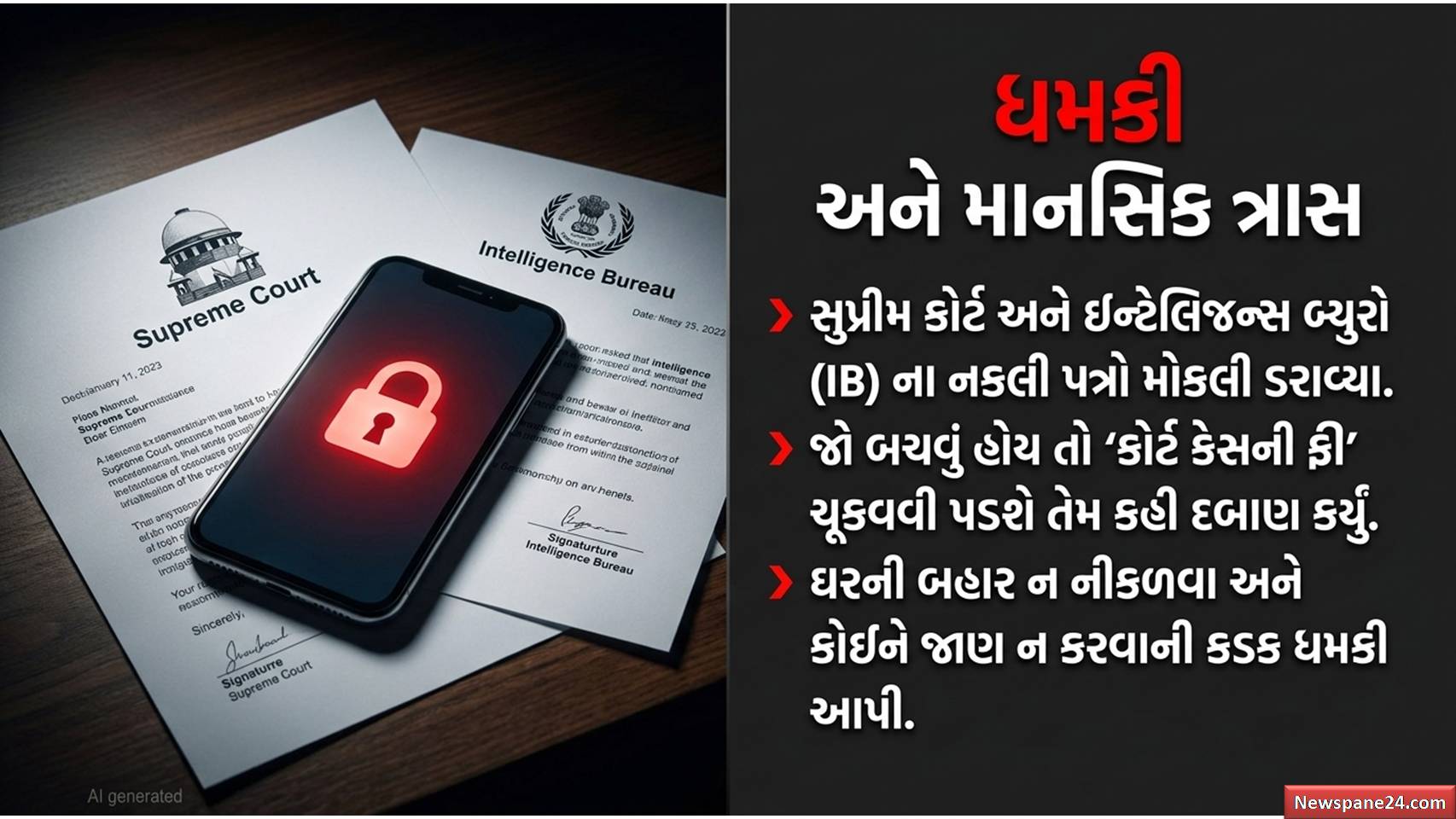 • નકલી દસ્તાવેજો: વૃદ્ધાને વોટ્સએપ પર સુપ્રીમ કોર્ટ અને ઇન્ટેલિજન્સ બ્યુરો (IB) ના લોગોવાળા નકલી પત્રો મોકલવામાં આવ્યા.