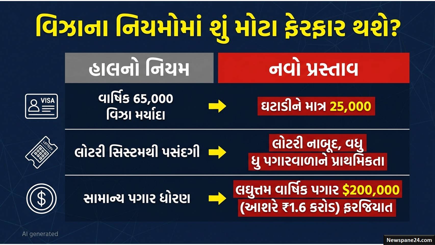 4. લોટરી સિસ્ટમની નાબૂદી: અત્યાર સુધી વિઝા લોટરી દ્વારા મળતા હતા, પરંતુ હવે તેને બદલે ‘વેજ-બેઝ્ડ’ (પગાર આધારિત) સિલેક્શન પ્રોસેસ લાવવાની વાત છે. એટલે કે જેનો પગાર સૌથી વધુ હશે, તેને જ વિઝા મળશે.