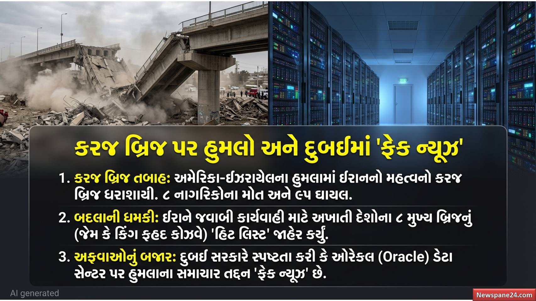 ઇઝરાયેલ-ઈરાન યુદ્ધ : ઈરાને વળતો પ્રહાર કરવાની ધમકી આપતા ખાડી દેશોના 8 મુખ્ય પુલોની યાદી જાહેર કરી છે, જેમાં કુવૈત અને સાઉદીના મહત્વના પુલો સામેલ છે. બીજી તરફ, દુબઈએ એવા અહેવાલોને નકારી કાઢ્યા છે કે ઈરાને ત્યાંના ઓરેકલ (Oracle) ડેટા સેન્ટર પર હુમલો કર્યો છે. દુબઈ સરકારે આ અહેવાલોને માત્ર “Fake News” ગણાવ્યા છે.