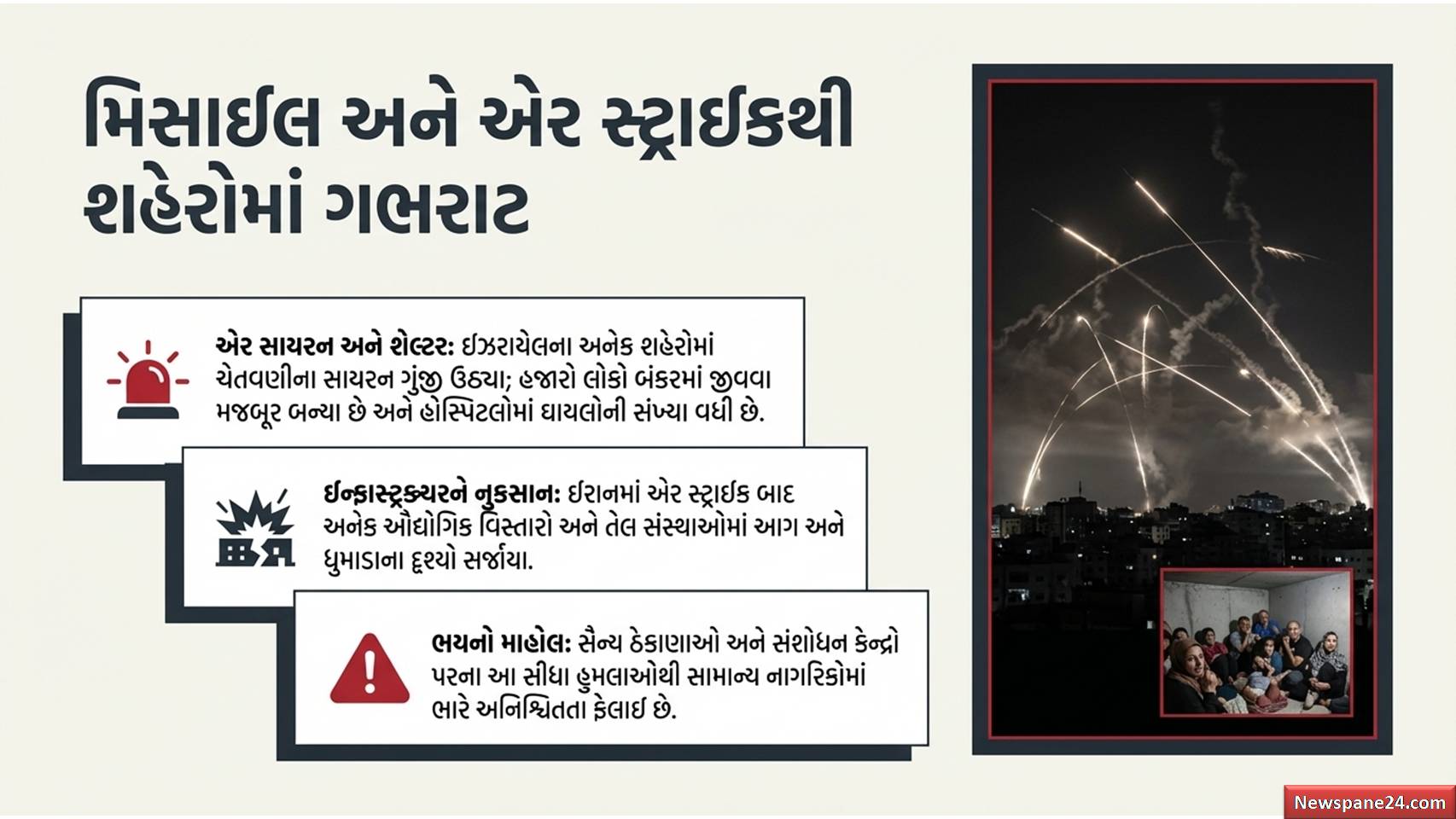 ઈઝરાયેલ ઈરાન મહાયુદ્ધ : આ આધુનિક યુદ્ધમાં બંને દેશોએ એકબીજાના સૈન્ય ઠેકાણાઓ, સંશોધન કેન્દ્રો અને મહત્વપૂર્ણ ઈન્ફ્રાસ્ટ્રક્ચરને નિશાન બનાવ્યા છે. ઈઝરાયેલના અનેક મોટા શહેરોમાં દિવસ-રાત એર સાયરન વાગી રહ્યા છે. સામાન્ય નાગરિકોની સ્થિતિ અત્યંત દયનીય બની છે, કારણ કે તેઓ સતત હુમલાના ડર હેઠળ બંકરો અને અંડરગ્રાઉન્ડ શેલ્ટરમાં આશરો લેવા મજબૂર બન્યા છે.