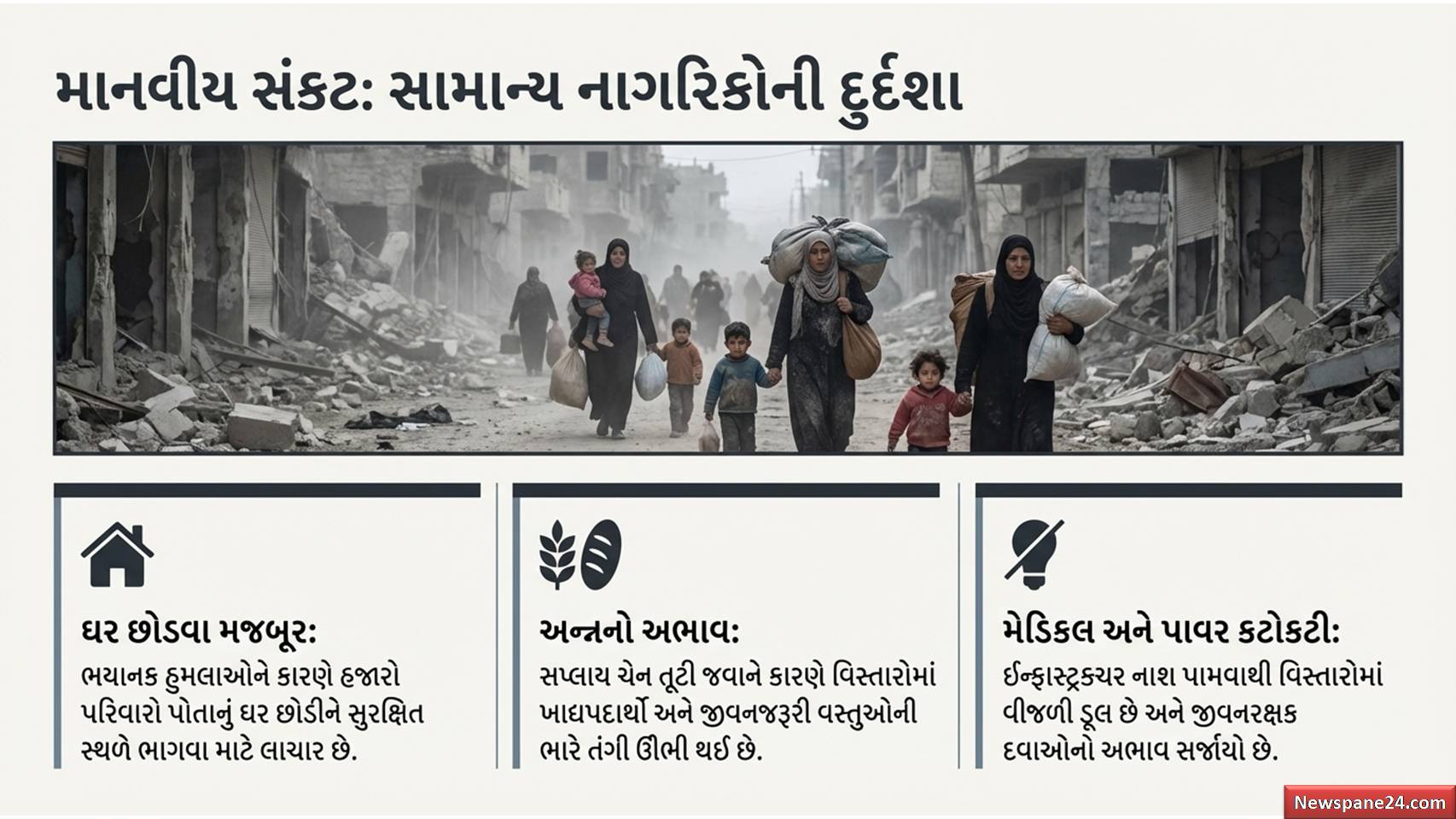 ઈઝરાયેલ ઈરાન મહાયુદ્ધ : યુદ્ધ હંમેશા વિનાશ લાવે છે અને તેનો સૌથી મોટો ભોગ નિર્દોષ નાગરિકો બને છે. હજારો લોકો પોતાનાં ઘર છોડીને સુરક્ષિત સ્થળે સ્થળાંતર કરી રહ્યા છે. યુદ્ધને કારણે ખોરાક, વીજળી અને દવાની ભારે તંગી સર્જાવાની આશંકા છે. એક મોટું માનવીય સંકટ ઊભું થઈ રહ્યું છે જેની અસર આગામી પેઢીઓ સુધી રહી શકે છે.