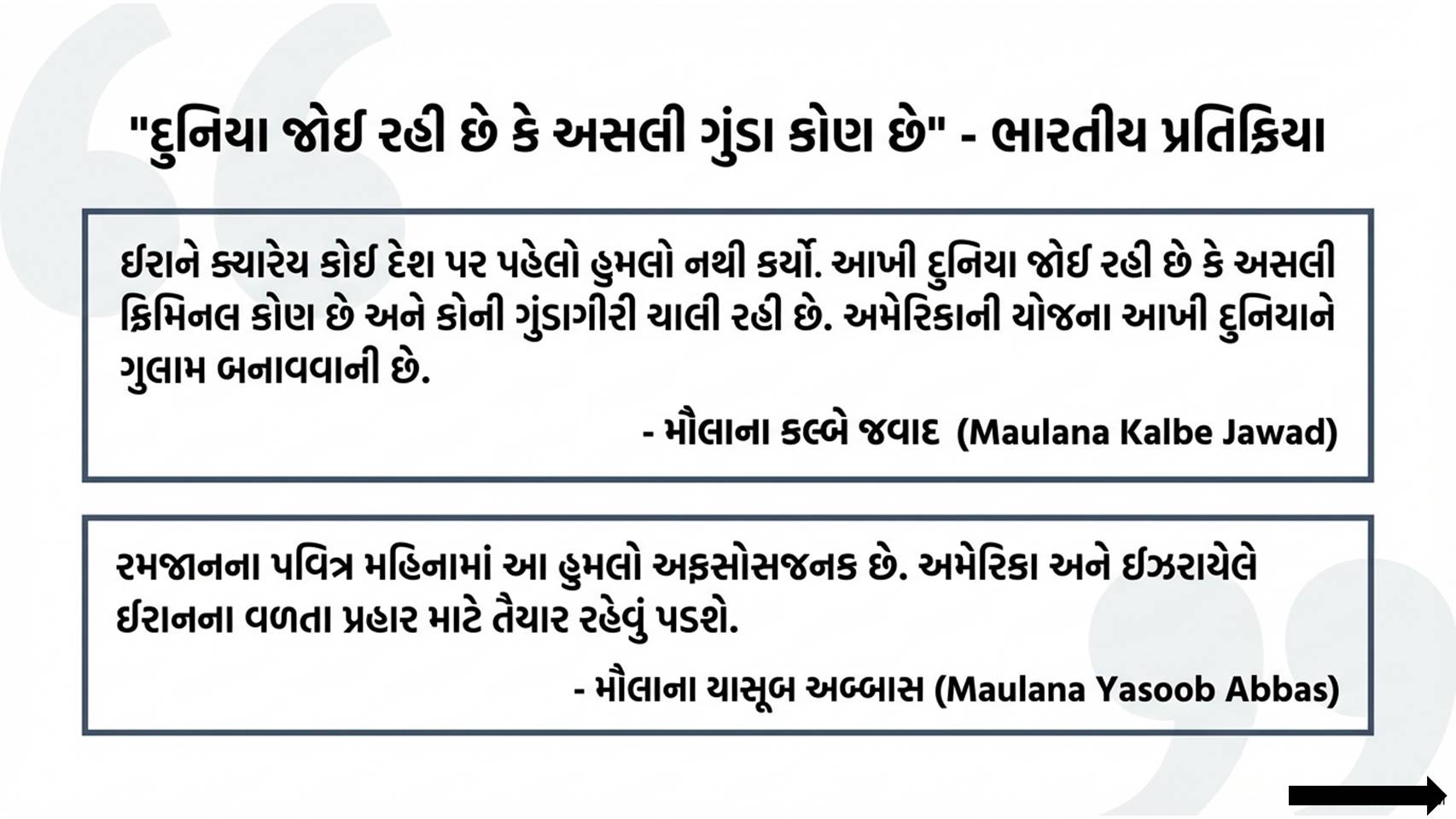 • લખનૌના જાણીતા શિયા ધર્મગુરુ મૌલાના કલ્બે જવાદ અને મૌલાના યાસૂબ અબ્બાસે અમેરિકા અને ઇઝરાયેલની કડક ટીકા કરી છે અને તેને ‘ગુંડાકિર્દી’ ગણાવી છે.