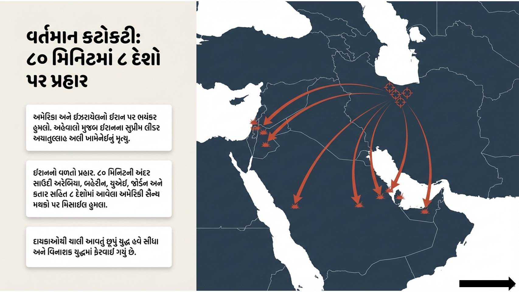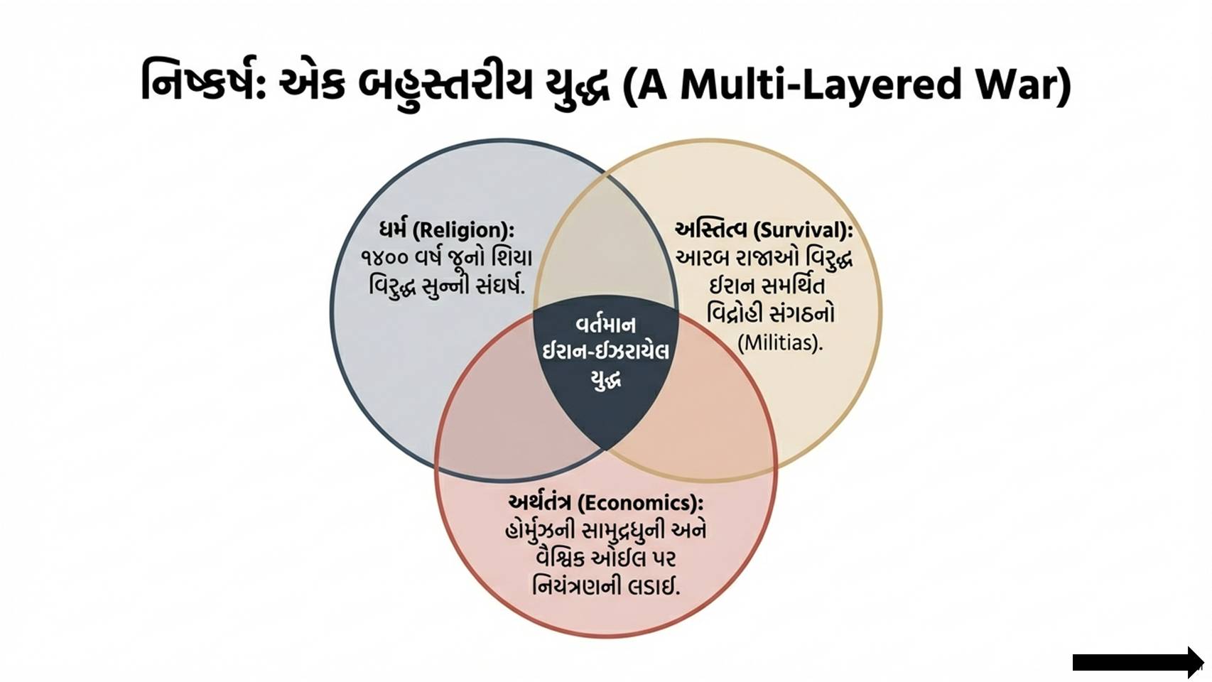 નિષ્કર્ષ : આ યુદ્ધ માત્ર સરહદોની લડાઈ નથી, પણ ધર્મ, રાજનીતિ અને તેલના વર્ચસ્વનો એક ખતરનાક ખેલ છે જેની અસરો આવનારા અનેક દાયકાઓ સુધી જોવા મળશે. આ સંઘર્ષ હવે ‘મુસ્લિમ વિરુદ્ધ યહૂદી’ ને બદલે ‘ઈરાન વિરુદ્ધ આરબ દેશો અને ઇઝરાયેલ’ જેવો બની રહ્યો છે. જો મધ્ય પૂર્વના દેશો એકમત નહીં થાય, તો આ વિસ્તાર લાંબા સમય સુધી હિંસાની આગમાં સળગતો રહેશે, જેની અસર વિશ્વના અનેક દેશોની આર્થિક લાઈફલાઈન ગણાતા પેટ્રોલ-ડીઝલના ભાવ પર પણ ચોક્કસ પડશે.