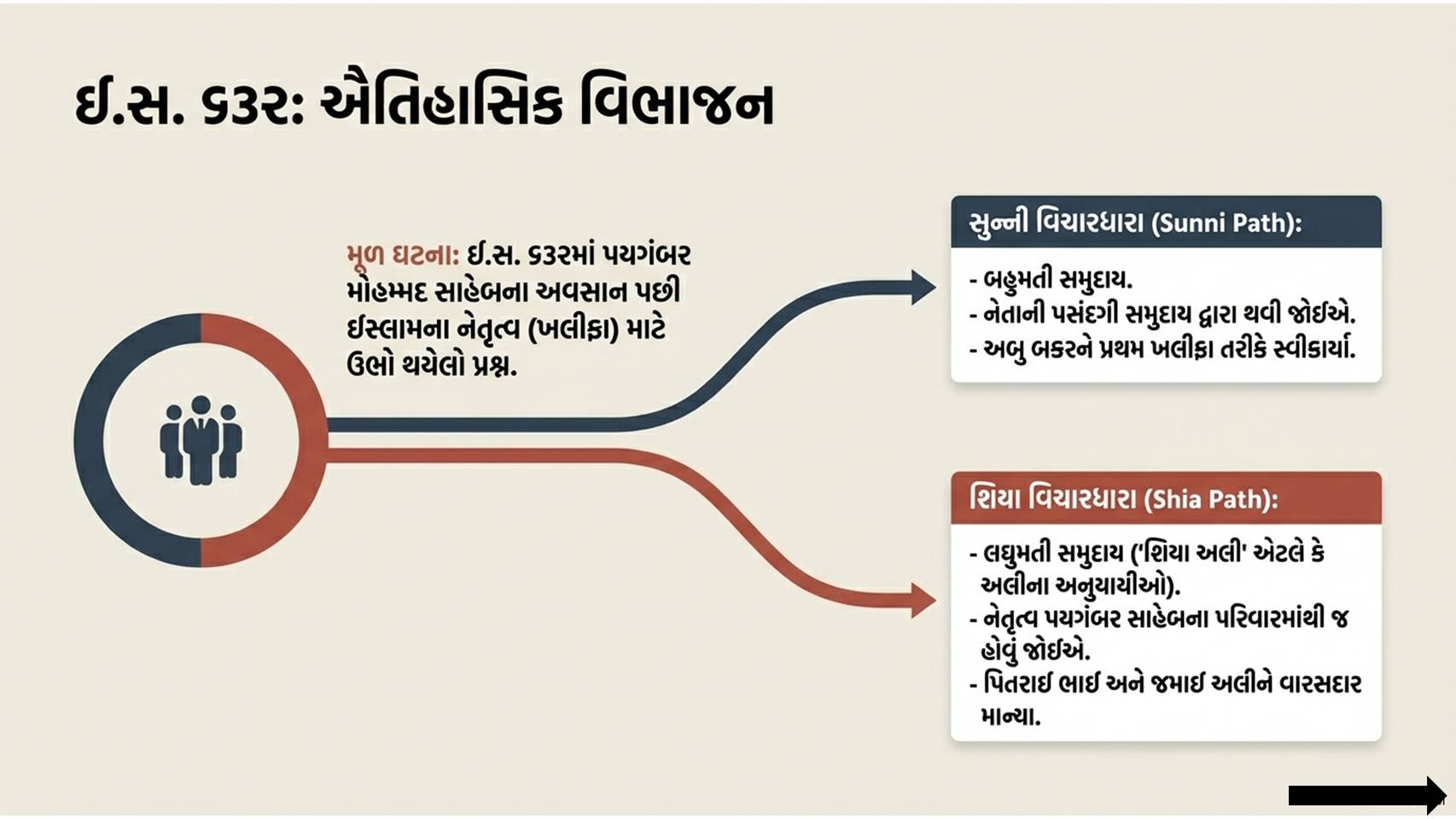 આજે દુનિયામાં લગભગ 85% મુસ્લિમો સુન્ની છે, જ્યારે ઈરાન બાકીના 15% શિયા મુસ્લિમોનું નેતૃત્વ કરતો સૌથી મોટો દેશ છે. આ વિભાજન ઈ.સ. 656માં ‘બેટલ ઓફ કેમલ’ અને ઈ.સ. 680માં કર્બલાના યુદ્ધ બાદ વધુ ઘેરું અને વીરોધી બન્યું, જ્યાં પેગંબર સાહેબના નવાસા ઇમામ હુસૈન શહીદ થયા હતા. શિયા સમુદાય આજે પણ મોહરમના દિવસે આ શહાદતનો શોક મનાવે છે.