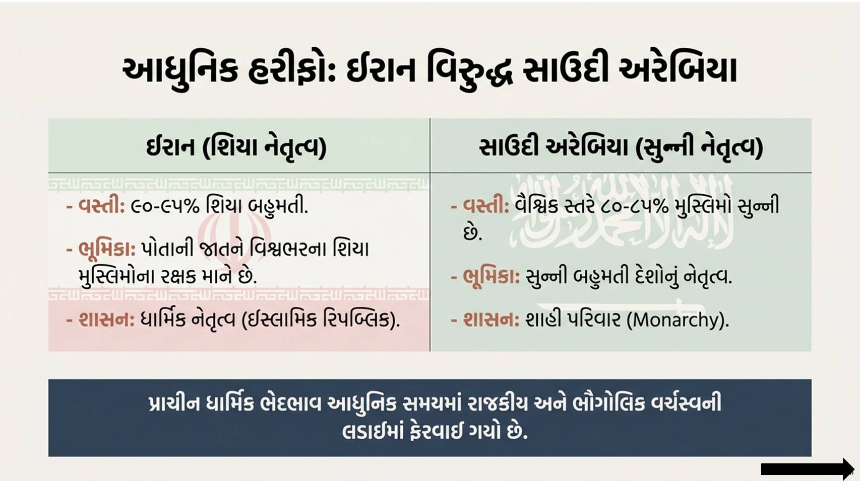 • શિયા ક્રેસન્ટ (Shia Crescent): ઈરાન લેબનાન, સીરિયા, ઈરાક અને યમન સુધી પોતાનો પ્રભાવ વધારીને એક ‘શિયા કોરિડોર’ બનાવવા માંગે છે, જેનાથી સુન્ની દેશોને પોતાની સત્તા જોખમમાં લાગે છે.