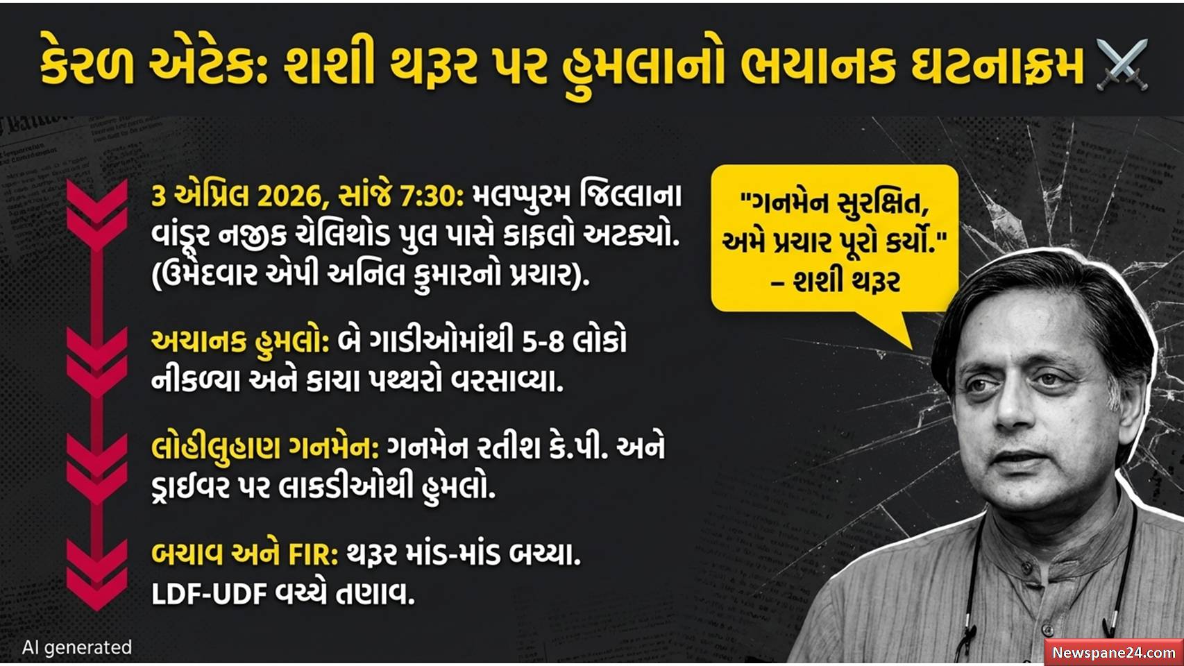 3 એપ્રિલે મલપ્પુરમમાં તેમના કાફલા પર પથ્થરમારો થયો, તેમના ગનમેન અને ડ્રાઇવરને લાકડીઓથી ફટકારવામાં આવ્યા. કદાચ કોંગ્રેસ હાઈકમાન્ડ એમ વિચારતું હશે કે થરૂર સાહેબની ‘ઓક્સફોર્ડ લેવલની અંગ્રેજી’ જ તેમની સુરક્ષા માટે કાફી છે, એટલે જ દિલ્હીથી કોઈ કડક પ્રતિક્રિયા આપવાની તસ્દી લેવામાં આવી નથી!.