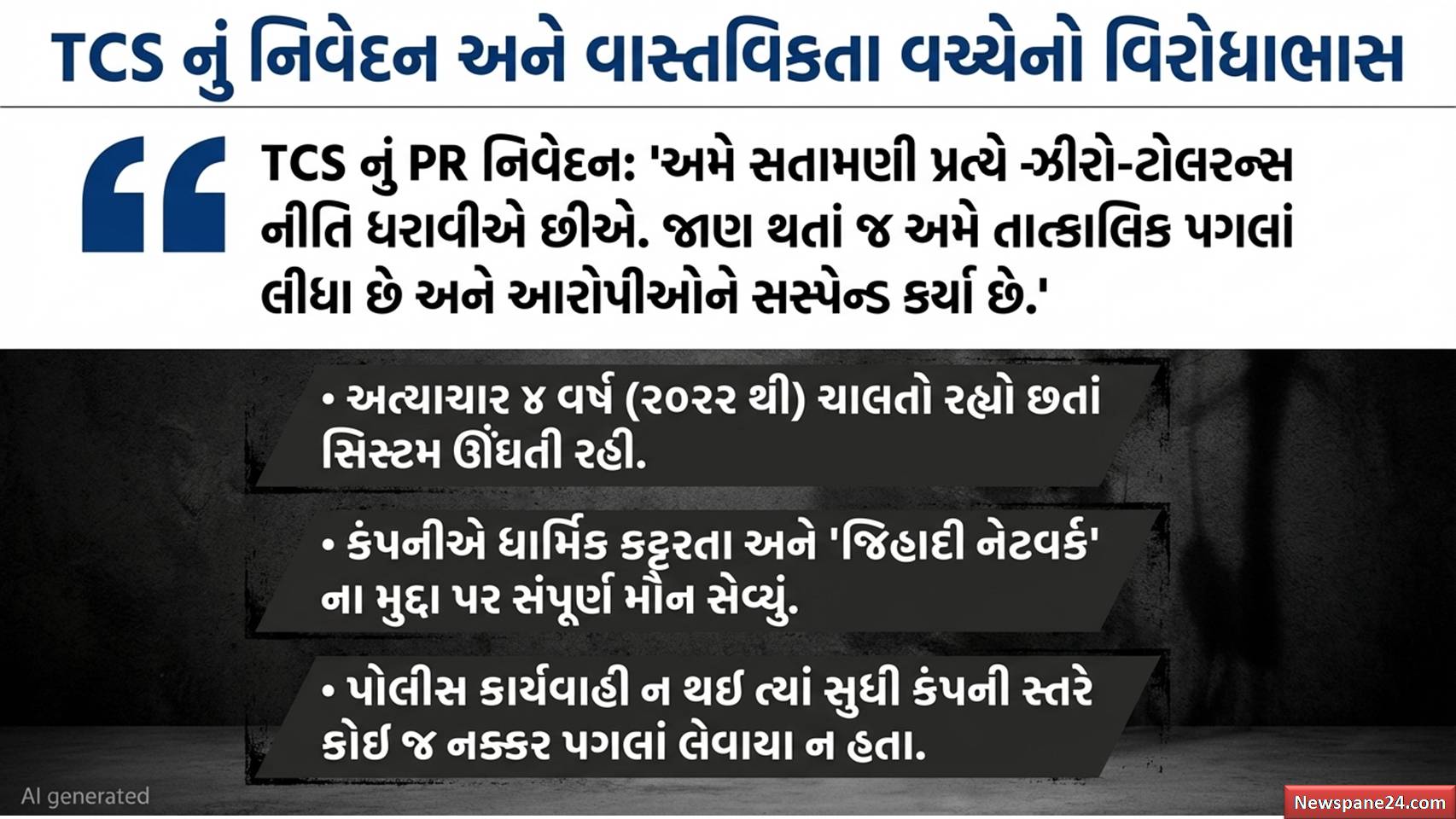 કોર્પોરેટ જેહાદ : આટલો મોટો વિવાદ થયા બાદ, ટાટા કન્સલ્ટન્સી સર્વિસીસ (TCS) એ રવિવારે એક નિવેદન બહાર પાડ્યું હતું. કંપનીએ જણાવ્યું કે તેઓ કોઈપણ પ્રકારના સતામણી પ્રત્યે ‘ઝીરો ટોલરન્સ’ની નીતિ ધરાવે છે. કંપનીએ આરોપી કર્મચારીઓને સસ્પેન્ડ કરી દીધા છે અને તેઓ પોલીસ તપાસમાં સંપૂર્ણ સહયોગ આપી રહ્યા છે. જોકે, ઘણા લોકો કંપનીના આ નિવેદનને માત્ર પીઆર સ્ટંટ (PR Spin) ગણાવી રહ્યા છે કારણ કે 4 વર્ષ સુધી કંપનીનું મેનેજમેન્ટ આ ગંભીર બાબતોથી અજાણ હતું.