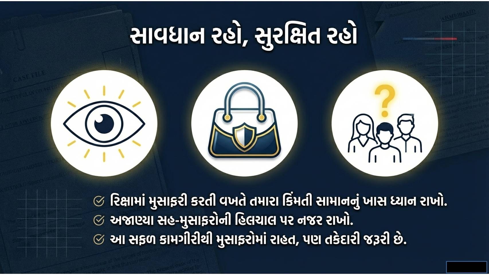 ક્રાઈમ બ્રાન્ચ : હાલમાં ક્રાઇમ બ્રાન્ચે આરોપી અને મુદ્દામાલ અડાલજ પોલીસને સોંપવા માટેની તજવીજ હાથ ધરી છે. આ સફળ કામગીરીને કારણે મુસાફરોમાં રાહતની લાગણી ફેલાઈ છે, પરંતુ પોલીસે હજુ પણ રિક્ષામાં મુસાફરી કરતી વખતે સાવધ રહેવાની અપીલ કરી છે.