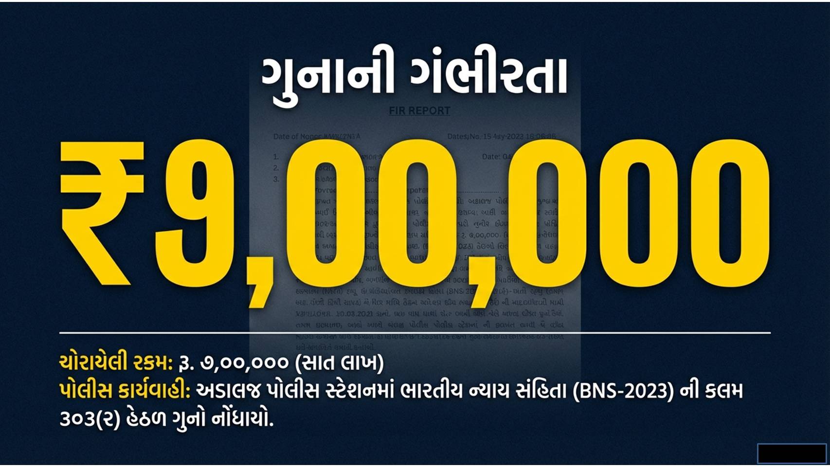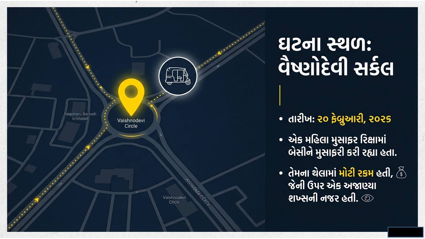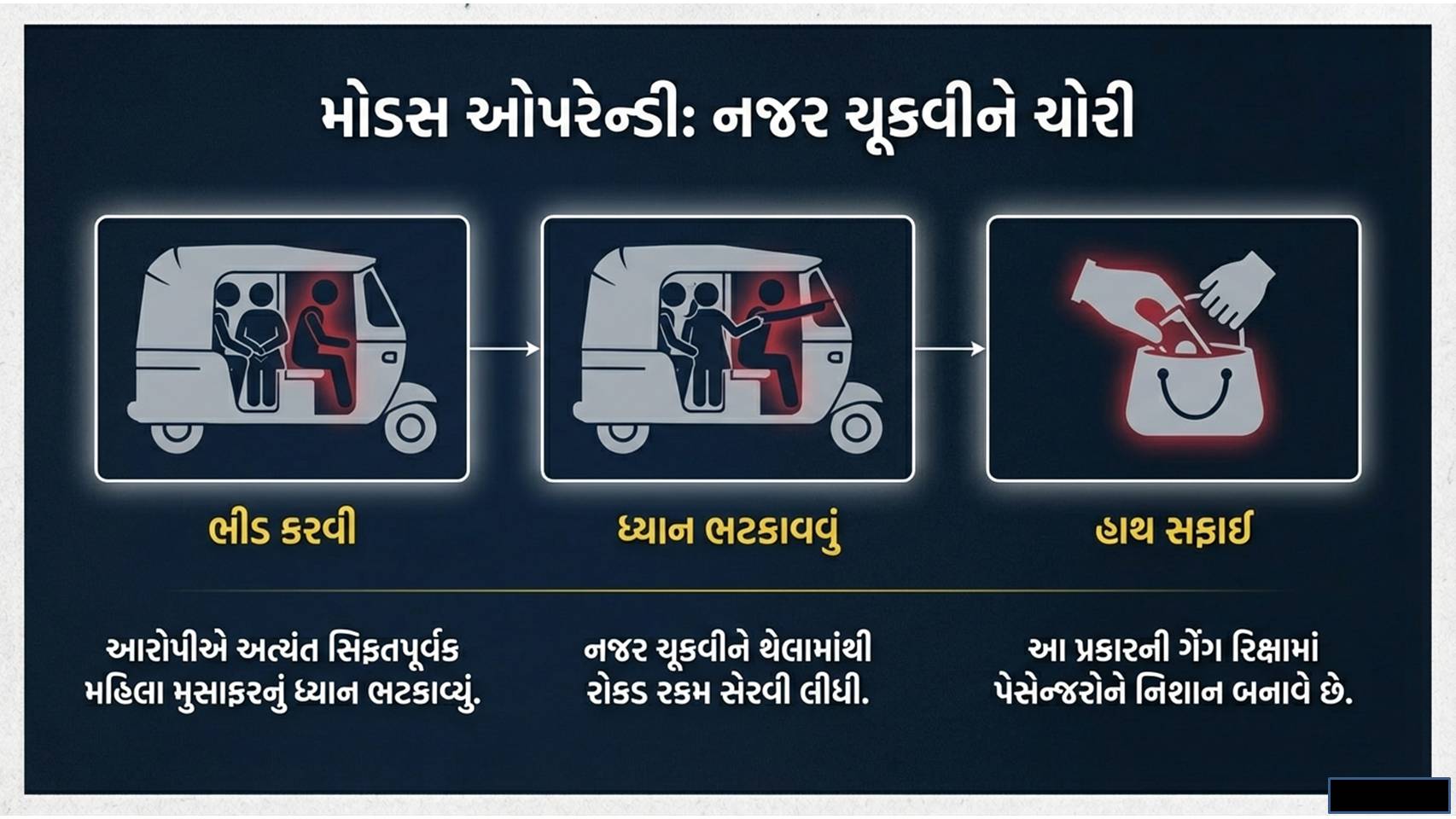 ગત ૨૦/૦૨/૨૦૨૬ના રોજ વૈષ્ણોદેવી સર્કલથી ઓટોરિક્ષામાં બેસેલા એક મહિલા મુસાફરના થેલામાંથી અજાણ્યા શખ્સે અત્યંત સિફતપૂર્વક ૭ લાખ રૂપિયાની રોકડ રકમ સેરવી લીધી હતી. આ મામલે અડાલજ પોલીસ સ્ટેશનમાં ભારતીય ન્યાય સંહિતા-૨૦૨૩ની કલમ ૩૦૩(૨) મુજબ ગુનો નોંધવામાં આવ્યો હતો.