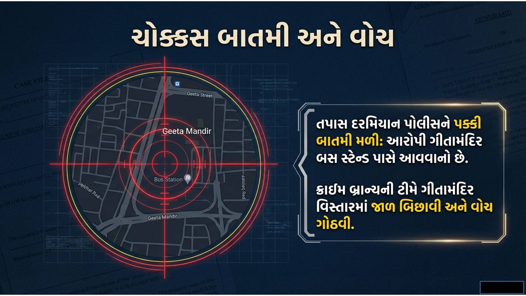 ક્રાઈમ બ્રાન્ચ : આ ગુનાની ગંભીરતાને ધ્યાને લઈને ક્રાઇમ બ્રાન્ચની ટીમે ઘટના સ્થળના CCTV ફૂટેજ અને હ્યુમન સોર્સ (બાતમીદારો) ની મદદ લીધી હતી. તપાસ દરમિયાન ચોક્કસ બાતમી મળી હતી કે ચોરીનો આરોપી ગીતામંદિર બસ સ્ટેન્ડ પાસે આવવાનો છે.