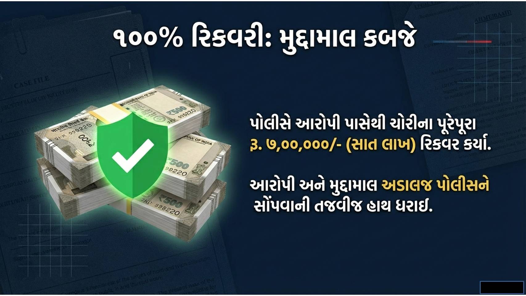 પોલીસે આરોપી મનસુખ પાસેથી ચોરીના પૂરેપૂરા રૂ. ૭,૦૦,૦૦૦/- (સાત લાખ) રિકવર કર્યા છે. પોલીસ તપાસમાં બહાર આવ્યું છે કે પકડાયેલ આરોપી રીઢો ગુનેગાર છે અને તેની સામે અગાઉ પણ અનેક ગુના નોંધાયેલા છે.