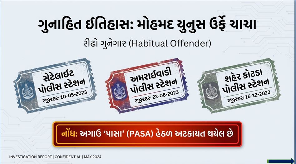 1. મોહમદ યુનુસ ઉર્ફે ચાચા (ઉં.વ. ૪૬): જેની સામે અગાઉ પણ સેટેલાઇટ અને અમરાઈવાડી પોલીસ સ્ટેશનમાં ગુના નોંધાયેલા છે.