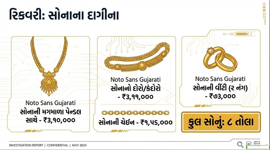 • સોનાની મગમાળા, ચેઈન, હાર અને વીંટીઓ (કિંમત અંદાજે રૂ. ૮.૫૦ લાખ).