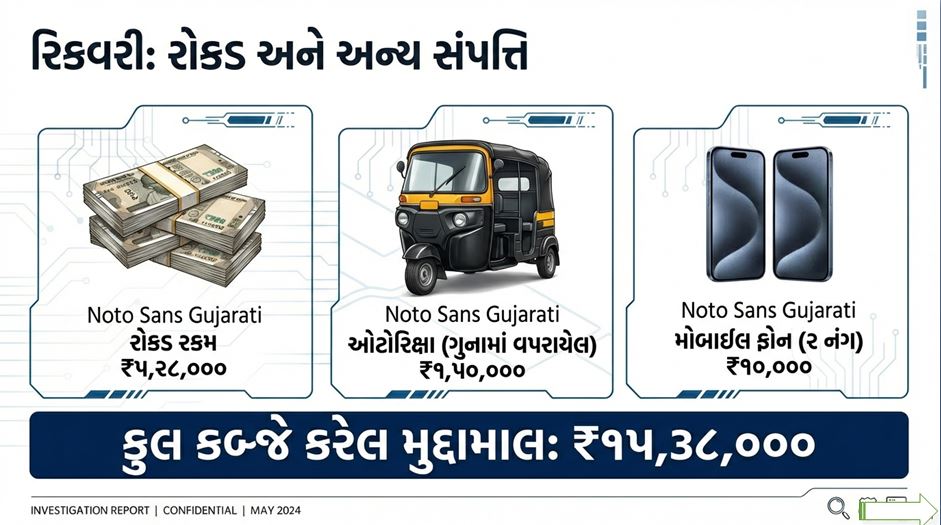 પોલીસે આ ટોળકી પાસેથી કુલ રૂપિયા ૧૫,૩૮,૦૦૦/- નો મુદ્દામાલ રિકવર કર્યો છે. જેમાં: