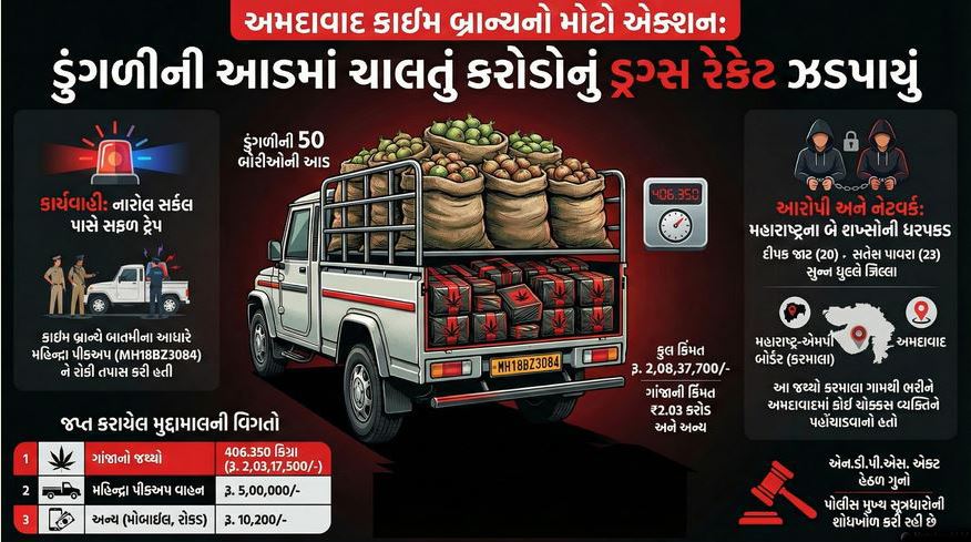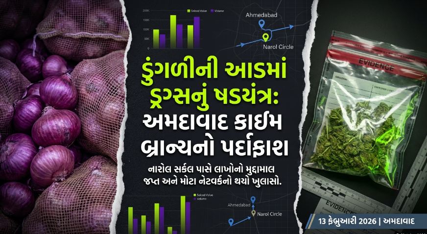 ક્રાઈમ બ્રાન્ચ : અમદાવાદ શહેરમાં નશાના કારોબારીઓ હવે નવી-નવી તરકીબો અજમાવી રહ્યા છે, પરંતુ અમદાવાદ પોલીસની સતર્કતા સામે તેમની દરેક ચાલ નિષ્ફળ સાબિત થઈ રહી છે [૪]. તાજેતરમાં જ ૧૩ ફેબ્રુઆરી ૨૦૨૬ ના રોજ અમદાવાદ સીટી ક્રાઇમ બ્રાન્ચે એક એવી કામગીરી કરી છે જેણે આખા શહેરમાં ચકચાર મચાવી દીધી છે. ડુંગળી ભરેલી ટ્રકમાં ડુંગળી નહીં, પણ ૨.૦૩ કરોડ રૂપિયાનો ગાંજો છુપાવેલો હતો.