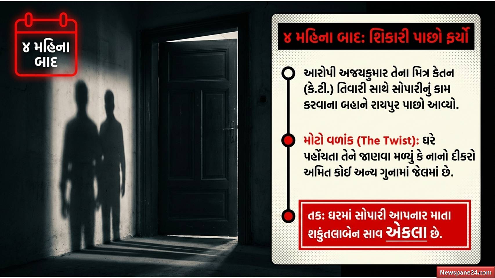 ક્રાઈમ બ્રાન્ચ : ચોંકાવનારી વાત એ છે કે, સોપારી લેનાર અજયકુમાર પૈસા લઈને વતનમાં ભાગી ગયો હતો. જ્યારે શકુંતલાબેન અને અમિતે તેને કામ પૂરું કરવા દબાણ કર્યું, ત્યારે તે તેના મિત્ર કેતન સાથે રાયપુર આવ્યો. ત્યાં તેને ખબર પડી કે નાનો દીકરો અમિત જેલમાં છે અને શકુંતલાબેન ઘરે એકલા જ છે.