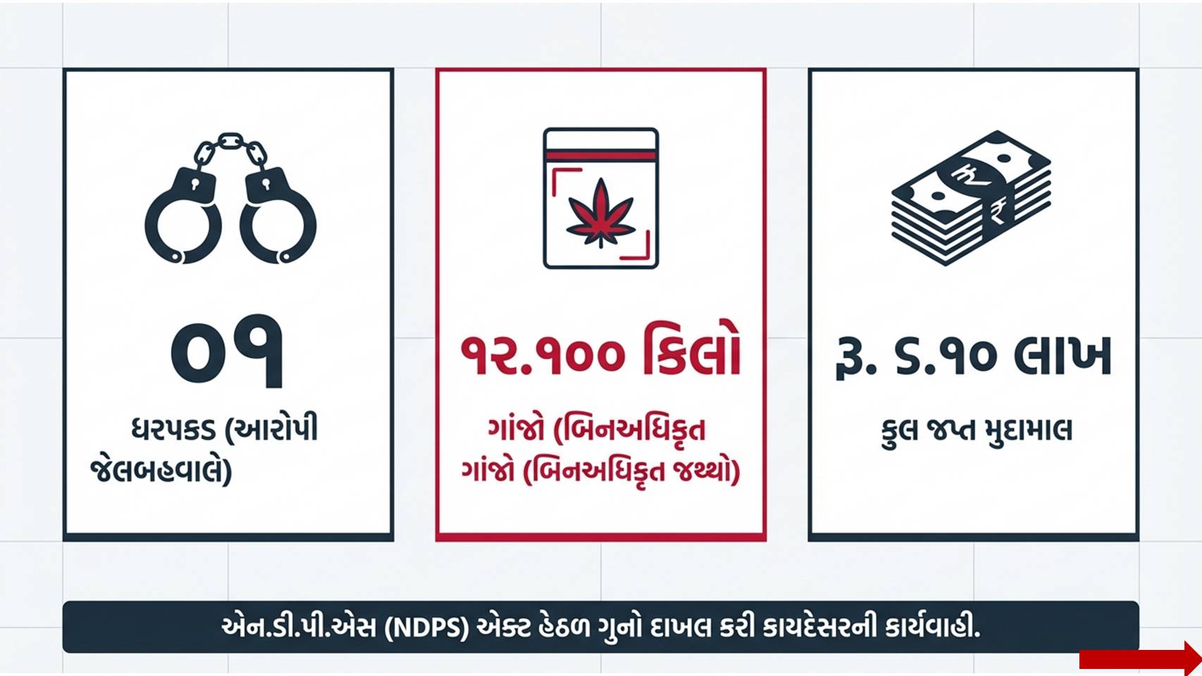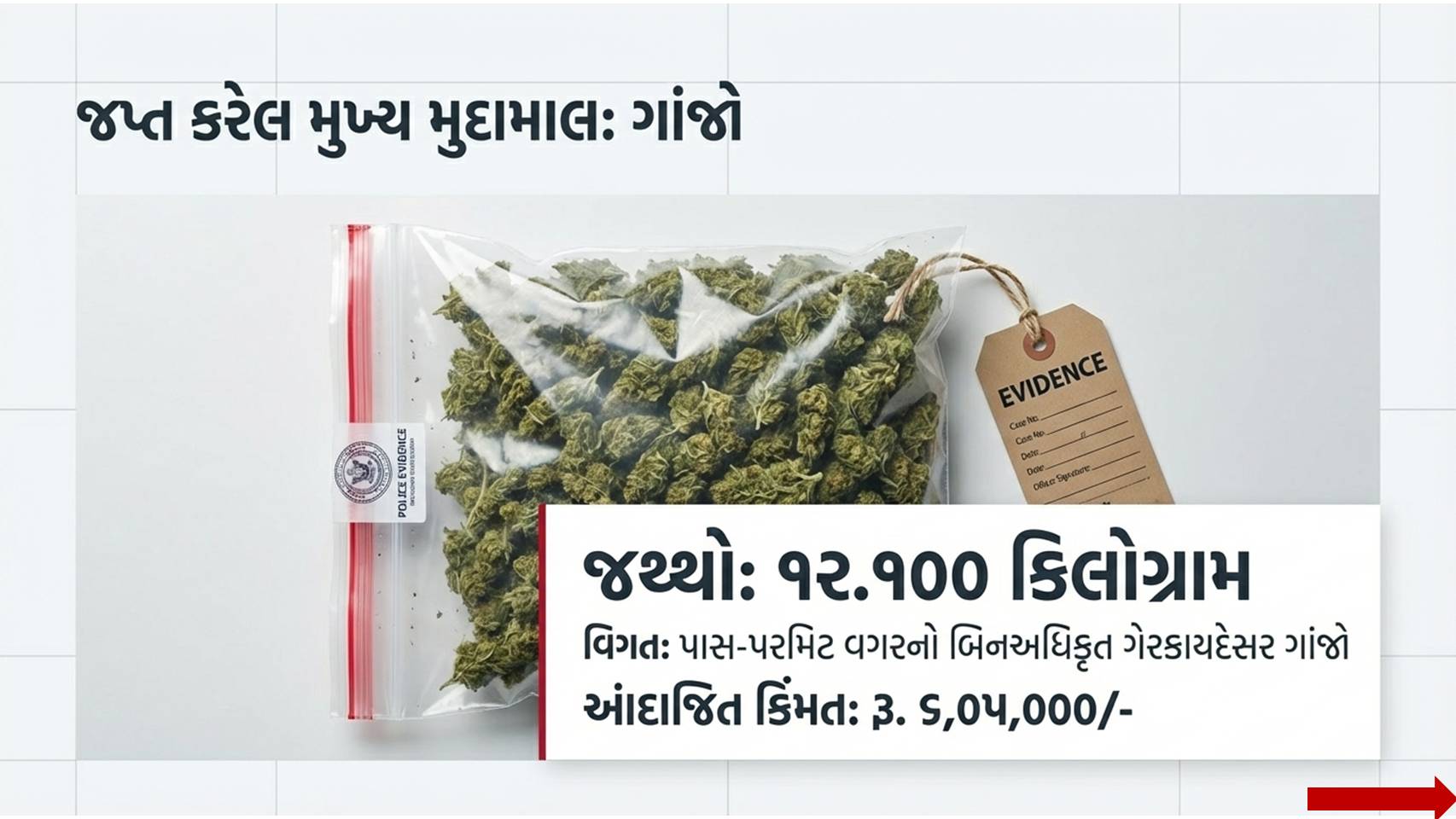 • ૧૨.૧૦૦ કિલોગ્રામ ગાંજો: જેની બજાર કિંમત અંદાજે રૂ. ૬,૦૫,૦૦૦ આંકવામાં આવી છે.