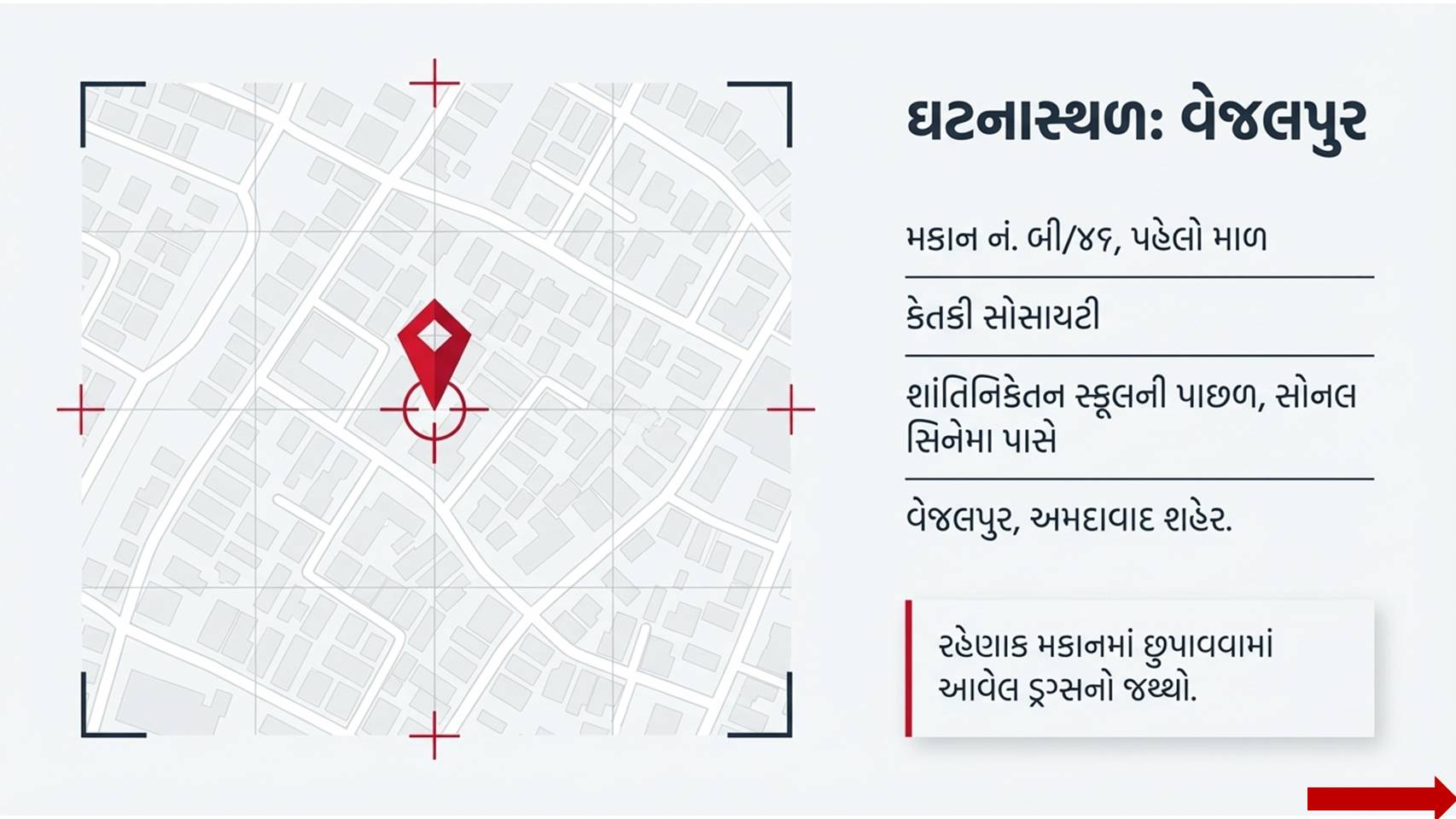 ક્રાઈમ બ્રાન્ચ : વેજલપુર વિસ્તારમાં આવેલી કેતકી સોસાયટી, જે શાંતિનિકેતન સ્કૂલની પાછળ અને સોનલ સિનેમા પાસે આવેલી છે, ત્યાંના એક મકાનમાં ગેરકાયદેસર પ્રવૃત્તિ ચાલતી હોવાની શંકા હતી [૧]. ક્રાઈમ બ્રાન્ચની ટીમે મકાન નંબર બી/૪૬ ના પહેલા માળે દરોડો પાડતા પોલીસ પણ ચોંકી ઉઠી હતી. અહીં કોઈ પરવાનગી વગર ગાંજાનો મોટો જથ્થો છુપાવી રાખવામાં આવ્યો હતો.