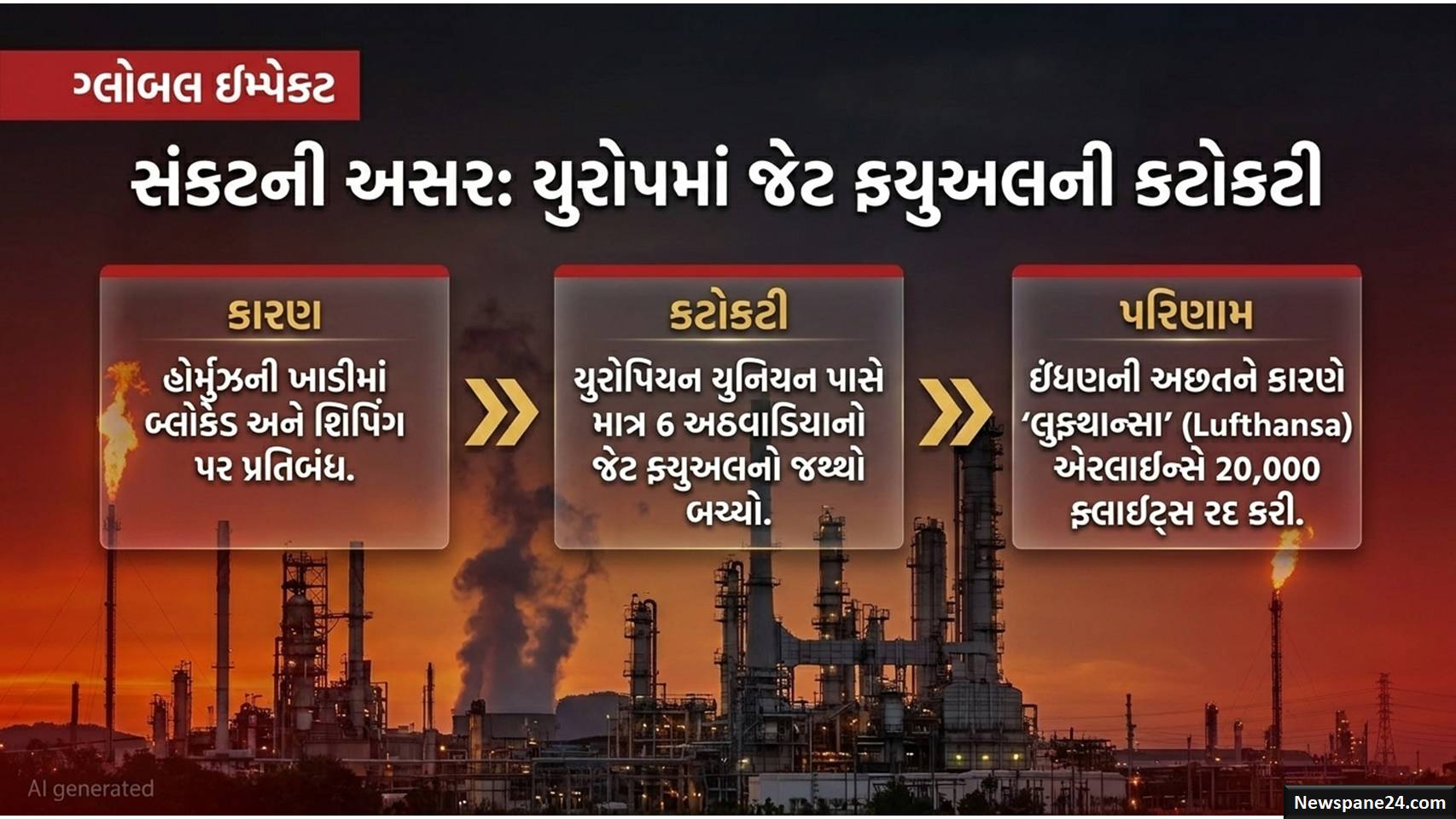 ખાડી યુદ્ધ : ભલે ફ્લાઈટ્સ શરૂ થઈ હોય, પણ પરિસ્થિતિ હજુ નાજુક છે. હોર્મુઝની સામુદ્રધુની (Strait of Hormuz) પરના નાકાબંધીને કારણે દુનિયાભરમાં જેટ ફ્યુઅલની અછત સર્જાઈ છે. યુરોપમાં સ્થિતિ એટલી ખરાબ છે કે લુફ્થાન્ઝા જેવી મોટી એરલાઇન્સે 20,000 થી વધુ ફ્લાઈટ્સ રદ કરવી પડી છે. ઈન્ટરનેશનલ એનર્જી એજન્સીએ તો એવી પણ ચેતવણી આપી છે કે યુરોપ પાસે હવે માત્ર છ અઠવાડિયાનું જ ઇંધણ બચ્યું છે.