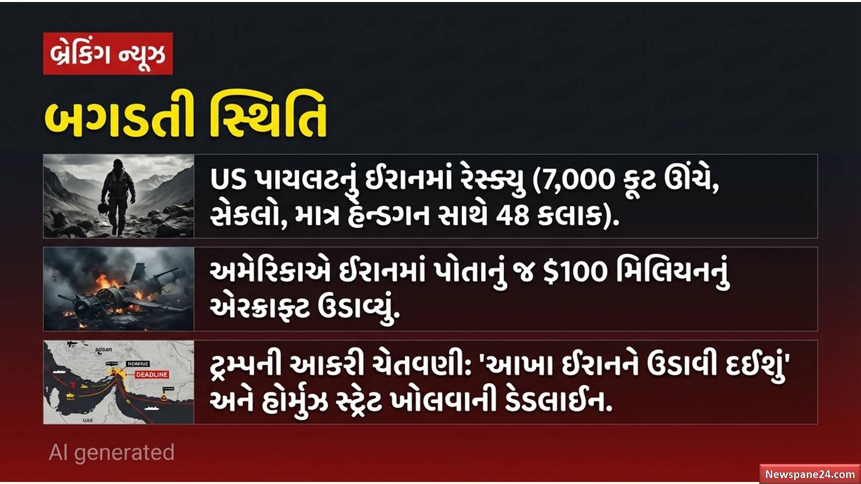 ખાડી યુદ્ધ : તાજેતરના અહેવાલો મુજબ, ટ્રમ્પ દ્વારા હોર્મુઝની સામુદ્રધુની (Strait of Hormuz) ખોલવા માટે આપવામાં આવેલી સમયસીમા નજીક આવી રહી છે, જેના જવાબમાં ઇરાને ટ્રમ્પને ‘ભ્રમિત’ ગણાવ્યા છે. બીજી તરફ, ટ્રમ્પે દાવો કર્યો છે કે ઇરાનમાં ગુમ થયેલા અમેરિકી વિમાનના ક્રૂ સભ્યોને એક સાહસિક ઓપરેશન દ્વારા સુરક્ષિત રીતે બચાવી લેવામાં આવ્યા છે.