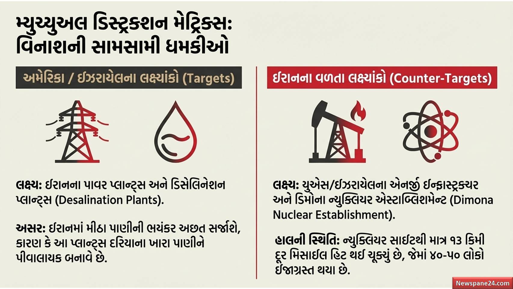 તેના જવાબમાં ઈરાને પણ વળતી ધમકી આપી છે કે જો તેના પાવર પ્લાન્ટ્સ પર હુમલો થયો, તો તે અમેરિકા અને ઈઝરાયેલના એનર્જી પ્લાન્ટ્સ પર ખુલ્લેઆમ હુમલા કરશે.