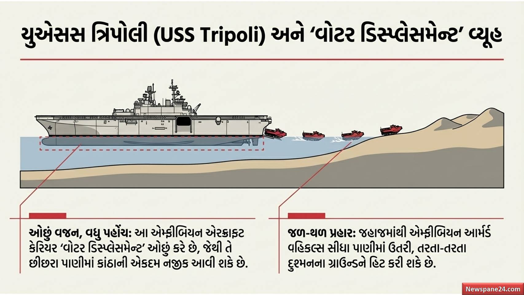 ખાડી યુદ્ધ : યુદ્ધની તૈયારીઓ રૂપે અમેરિકાએ તેનું અત્યંત શક્તિશાળી એમ્ફીબિયન એરક્રાફ્ટ કેરિયર USS ત્રિપોલી (USS Tripoli) મિડલ ઈસ્ટ તરફ રવાના કર્યું છે. આ જહાજની ખાસિયત એ છે કે તે કિનારાની નજીક જઈ શકે છે અને ત્યાંથી સેના ઉતારી શકે છે. એટલું જ નહીં, અમેરિકાના વર્લ્ડ વોર-1 ના સમયથી પ્રખ્યાત એવા ખતરનાક કમાન્ડો યુનિટ ‘ડેવિલ ડોગ્સ’ (Devil Dogs) ના ૭,૦૦૦ થી ૧૦,૦૦૦ સૈનિકો પણ આ વિસ્તારમાં તૈનાત કરવામાં આવી રહ્યા છે.