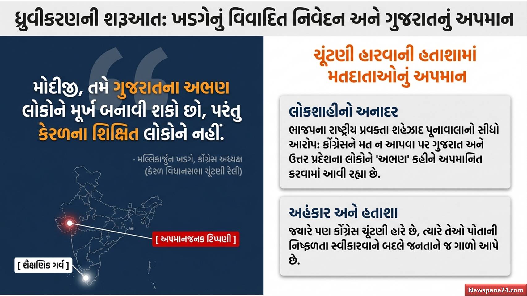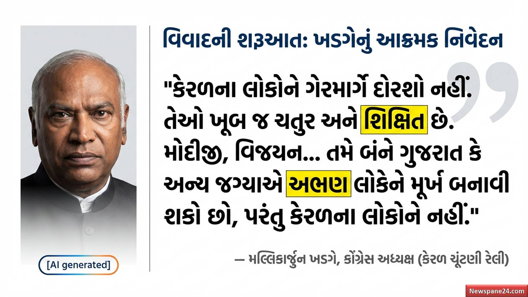 ગરવી ગુજરાત : કેરળના ઈડુક્કીમાં એક ચૂંટણી રેલીને સંબોધતા મલ્લિકાર્જુન ખડગેએ જે વિષવમન કર્યું તે આઘાતજનક છે. તેમણે કહ્યું કે, “પીએમ મોદી અને કેરળના સીએમ વિજયન ગુજરાતના અશિક્ષિત (Illiterate) લોકોને મૂર્ખ બનાવી શકે છે, પણ કેરળના શિક્ષિત લોકોને નહીં”.