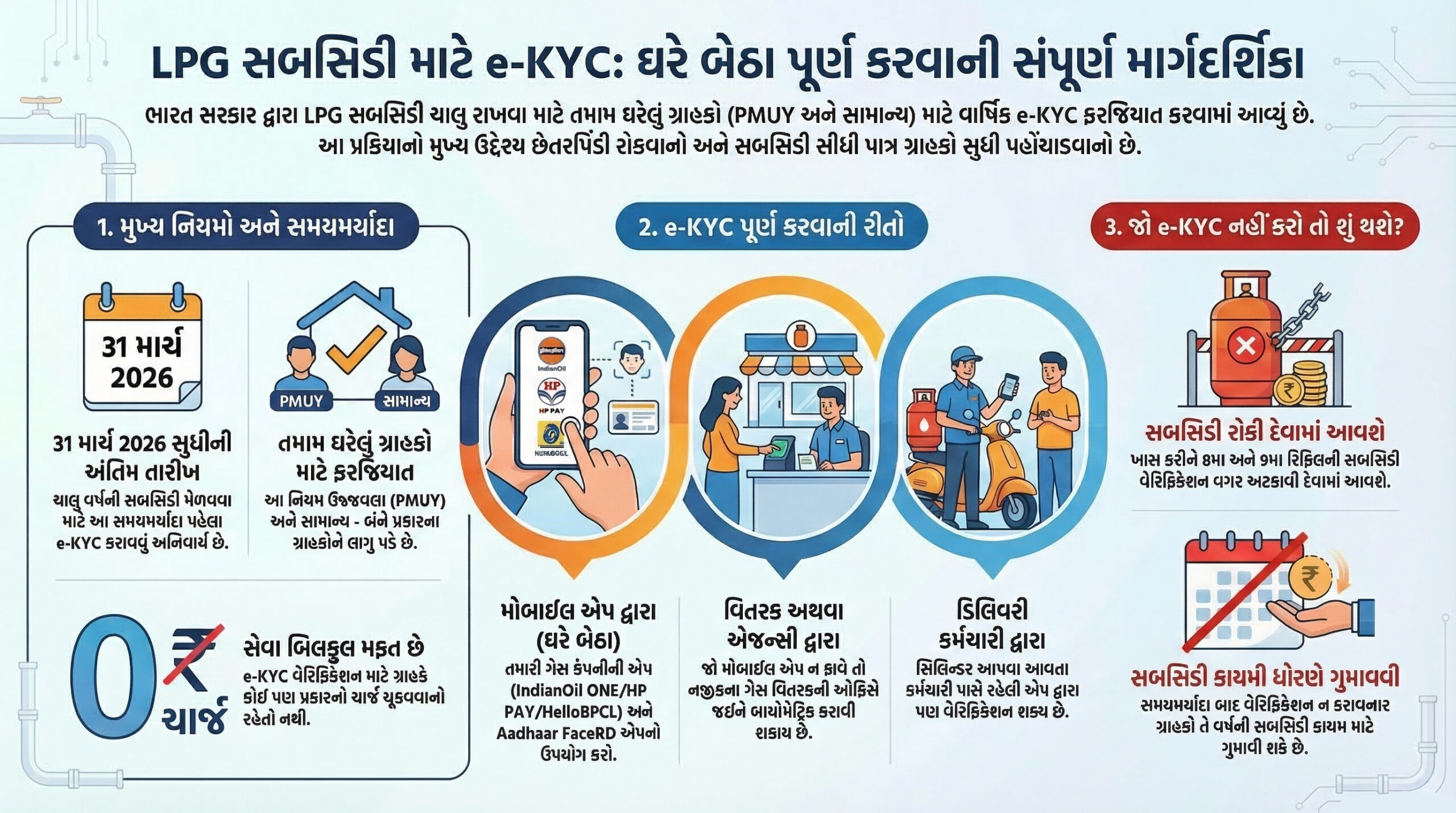 ગેસ ગ્રાહક : ઘણા ગ્રાહકોને પ્રશ્ન થાય છે કે જો તેઓ આ પ્રક્રિયા પૂરી નહીં કરે તો શું ગેસ મળતો બંધ થઈ જશે? જવાબ છે – ના. ગેસની સપ્લાય ચાલુ રહેશે, પરંતુ તમારી સબસિડી અટકાવી દેવામાં આવશે.