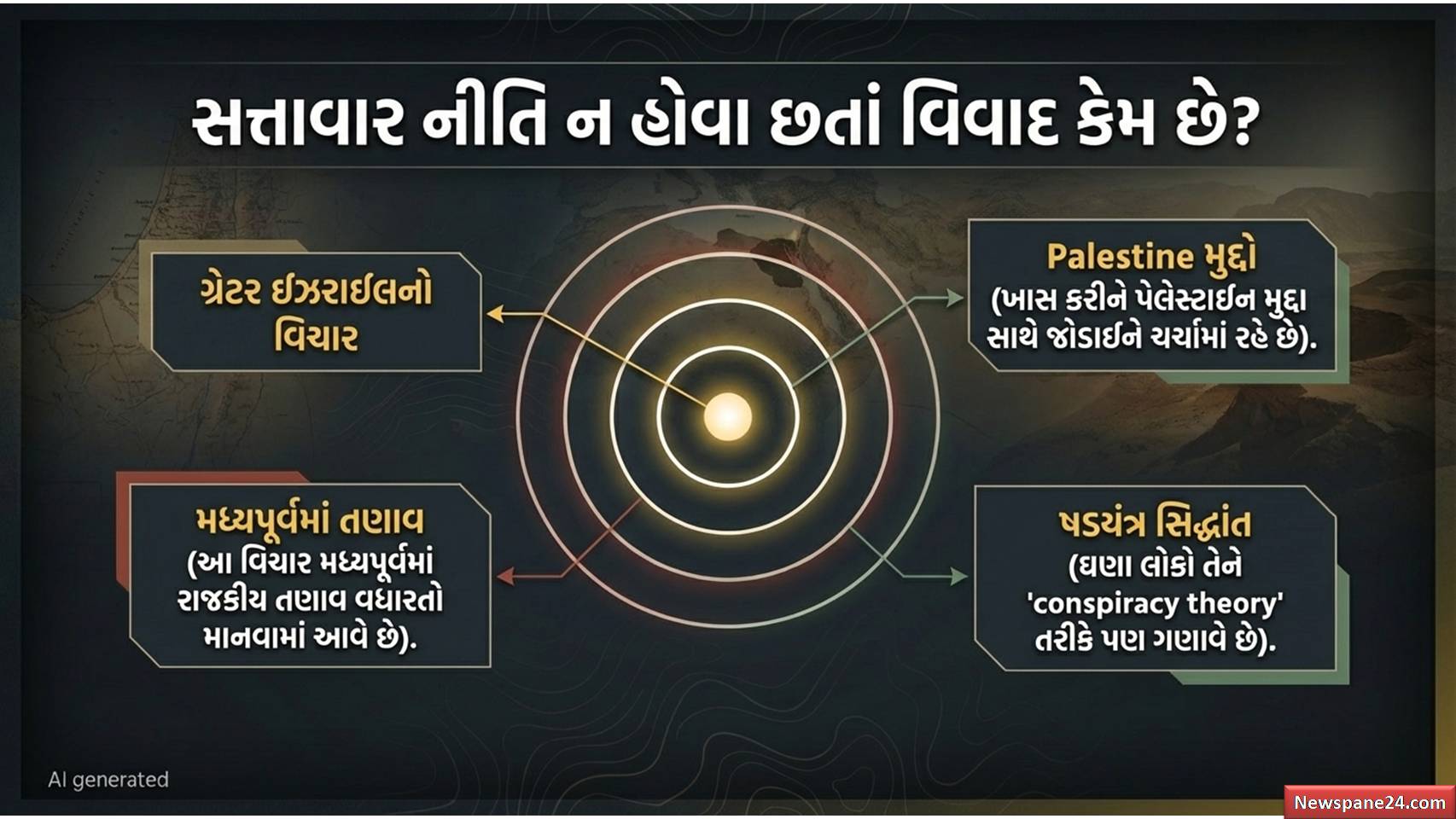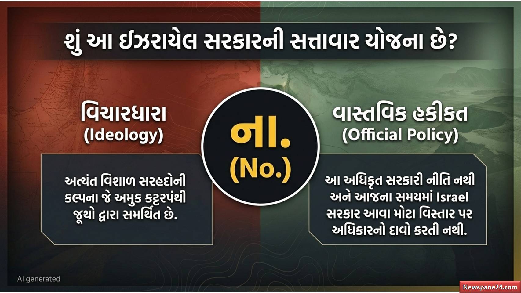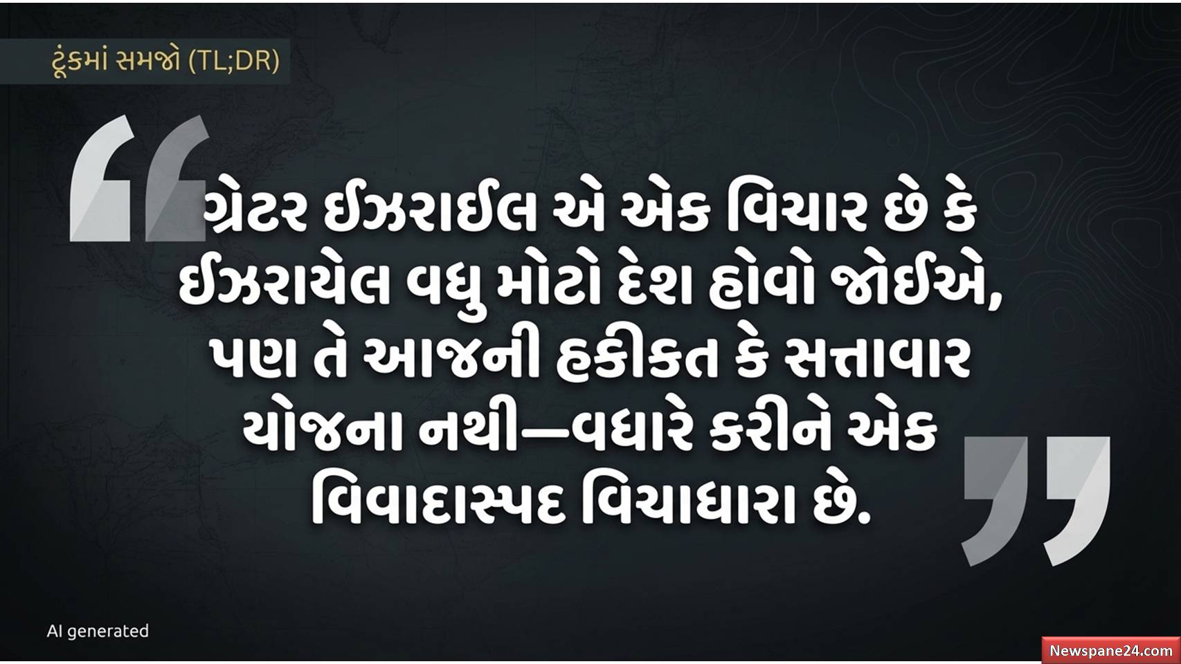 “ગ્રેટર ઇઝરાઈલ” એ કોઈ સત્તાવાર યોજના નથી, પરંતુ એક વિવાદાસ્પદ વિચારધારા છે જે સોશિયલ મીડિયા પર ગેરસમજ અને પ્રોપેગાંડા ફેલાવવાનું સાધન બની ગઈ છે. વાસ્તવિકતા એ છે કે જ્યાં સુધી બંને પક્ષો એકબીજાના અસ્તિત્વનો સ્વીકાર કરીને શાંતિ મંત્રણા નહીં કરે, ત્યાં સુધી આ લોહિયાળ સંઘર્ષનો અંત આવવો મુશ્કેલ છે.