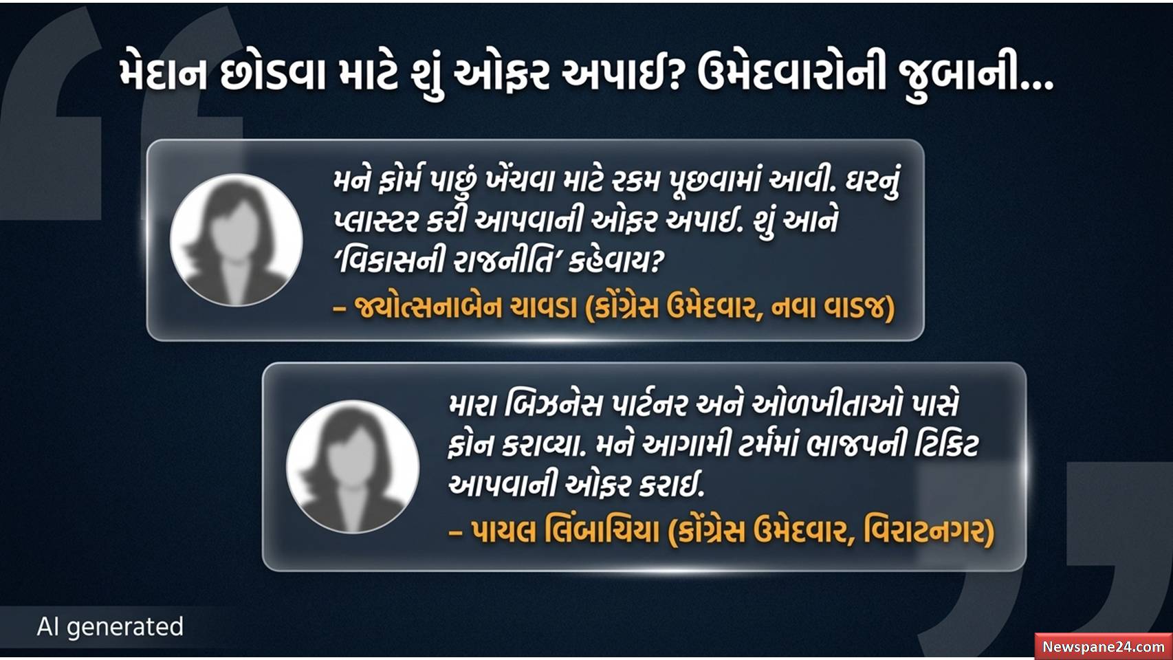 નવા વાડજ વોર્ડના કોંગ્રેસના ઉમેદવાર જ્યોત્સનાબેન ચાવડાએ હિંમતભેર જણાવ્યું કે, “મને ફોર્મ ખેંચવા માટે મોટી રકમની ઓફર કરવામાં આવી હતી. મારા ઘરને પ્લાસ્ટર કરી આપવા જેવી સવલતોની પણ લાલચ અપાઈ હતી, પણ હું કોંગ્રેસ સાથે ગદ્દારી નહીં કરું”. આવી જ રીતે વિરાટનગરના ઉમેદવાર પાયલ લીંબચીયાએ પણ દાવો કર્યો કે તેમને પ્રભાવશાળી લોકો દ્વારા ફોન કરીને ફોર્મ ખેંચવા દબાણ કરવામાં આવ્યું હતું.