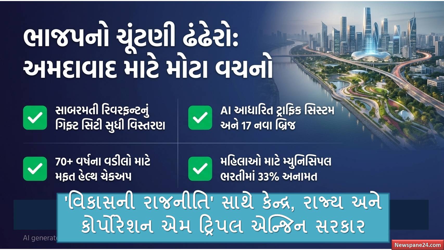 એક તરફ જ્યારે આ વિવાદ ચાલી રહ્યો છે, ત્યારે ભાજપે અમદાવાદ માટે પોતાનો સંકલ્પ પત્ર (મેનિફેસ્ટો) જાહેર કર્યો છે. જેમાં ભાજપ આ વખતે ‘વિકાસની રાજનીતિ’ અને કેન્દ્ર, રાજ્ય અને કોર્પોરેશન એમ ટ્રિપલ એન્જિન સરકારની શક્તિના જોરે મતદારોને આકર્ષવાના મિશન પર છે. અમદાવાદ માટેના તેમના સંકલ્પ પત્રમાં સાબરમતી રિવરફ્રન્ટને ગિફ્ટ સિટી સુધી લંબાવવા, આર્ટિફિશિયલ ઈન્ટેલિજન્સ (AI) આધારિત ટ્રાફિક મેનેજમેન્ટ, ૧૭ નવા બ્રિજ અને ૧૦૦% સોલર એનર્જી જેવા અત્યાધુનિક પ્રોજેક્ટ્સનો સમાવેશ કરવામાં આવ્યો છે. ભાજપ પારદર્શિતા માટે તમામ મ્યુનિસિપલ પ્રોજેક્ટ્સનું જીઓ-ટેગિંગ અને ૭૦ વર્ષથી વધુ વયના વરિષ્ઠ નાગરિકો માટે ઘરબેઠાં મફત સ્વાસ્થ્ય તપાસ જેવા વાયદાઓ દ્વારા પોતાની વિકાસલક્ષી છબી મજબૂત કરી રહી છે.