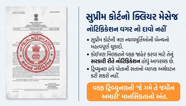 સુપ્રીમ કોર્ટની ત્રણ ન્યાયમૂર્તિઓની બેન્ચે વક્ફ ટ્રિબ્યુનલ સંબંધિત એક મહત્વપૂર્ણ ચુકાદો આપ્યો છે. આ ચુકાદામાં કોર્ટે સ્પષ્ટ કર્યું છે કે કોઈપણ મિલકતને વક્ફ જાહેર કરવા માટે તેનું સરકારી રીતે નોટિફિકેશન હોવું આવશ્યક છે.