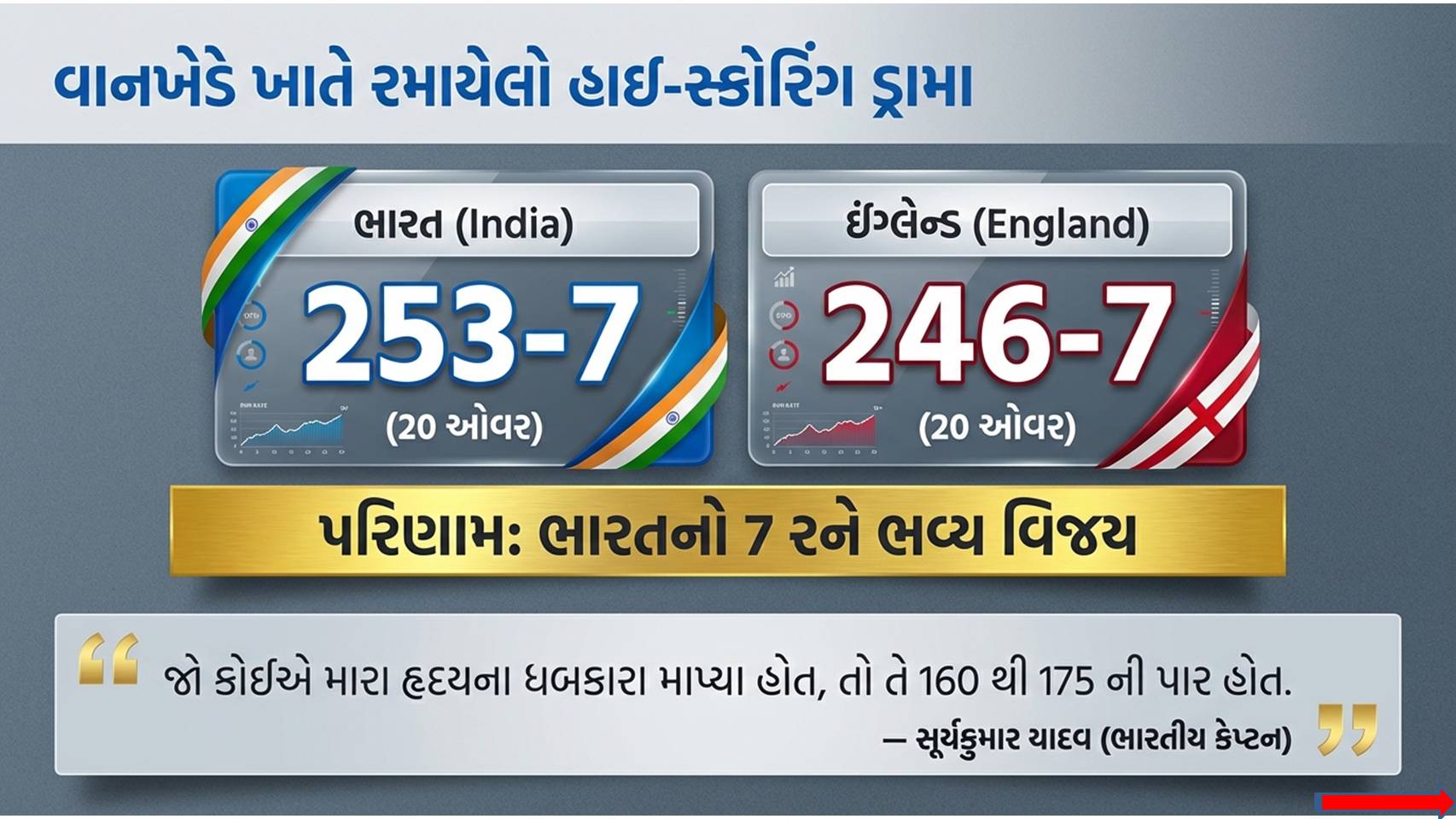 વિલ જેક્સ (35 રન) અને બેથેલ વચ્ચેની 77 રનની ભાગીદારીએ મેચને અંતિમ ઓવર સુધી ખેંચી ગઈ હતી. પરંતુ હાર્દિક પંડ્યા અને જસપ્રીત બુમરાહની ચોકસાઈભરી બોલિંગે ભારતને મેચમાં જાળવી રાખ્યું.