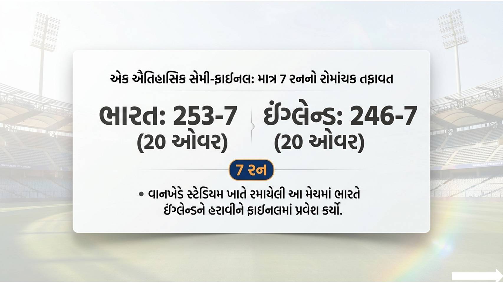 મુંબઈ: ક્રિકેટના મક્કા ગણાતા મુંબઈના વાનખેડે સ્ટેડિયમમાં ગુરુવારે રાત્રે જે જોવા મળ્યું તે વર્ષો સુધી ક્રિકેટ પ્રેમીઓના હૃદયમાં જીવંત રહેશે. શ્વાસ અધ્ધર કરી દેનારી મેચમાં ભારતે ડિફેન્ડિંગ ચેમ્પિયન ઇંગ્લેન્ડને 7 રનથી હરાવીને T20 વર્લ્ડ કપ 2026ની ફાઈનલમાં પ્રવેશ કરી લીધો છે. હવે રવિવારે અમદાવાદના નરેન્દ્ર મોદી સ્ટેડિયમમાં ભારત અને ન્યુઝીલેન્ડ વચ્ચે વિશ્વ વિજેતા બનવા માટે જંગ જામશે.